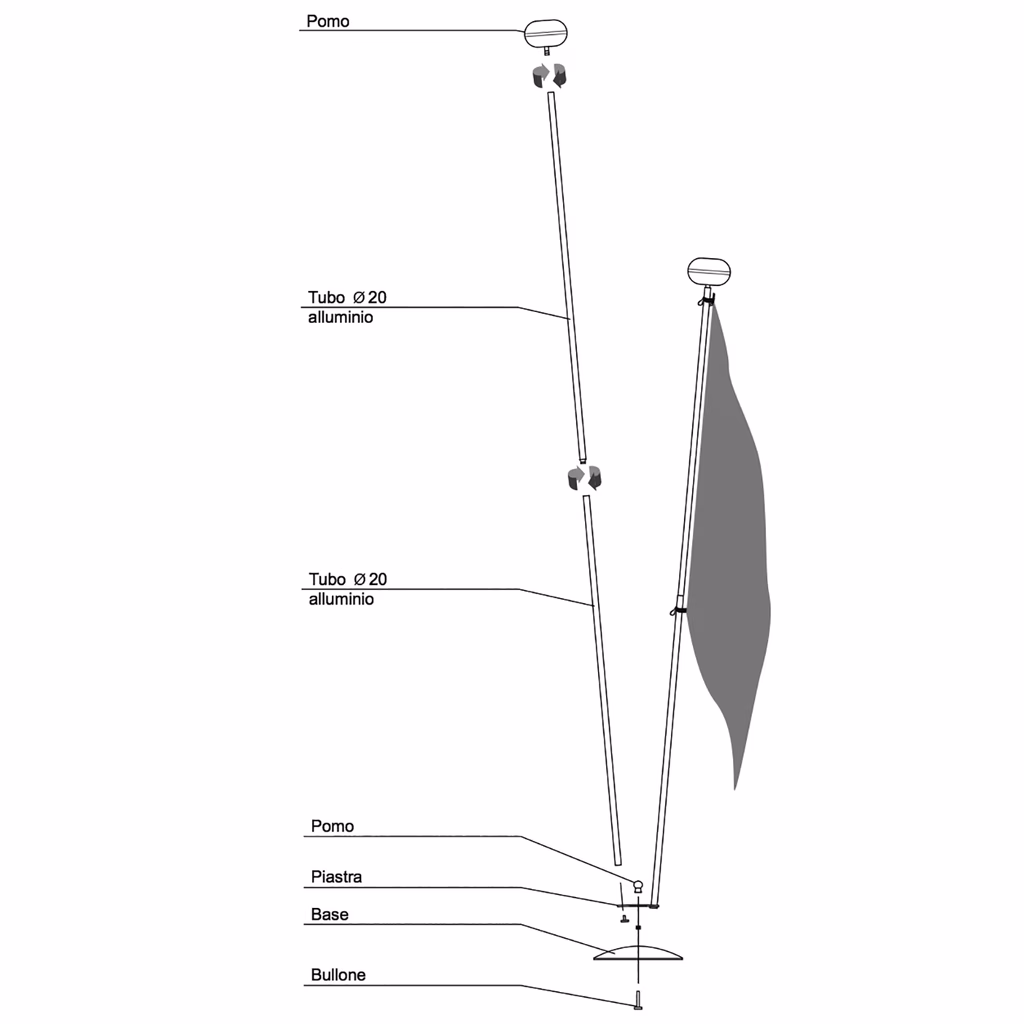 Piedistallo da sala ECONOMY di design semplice realizzato in alluminio anodizzato. Disponibile a 1, 2, 3, 4 o 5 posti. Kit composta da: asta in alluminio Ø mm 20 + base in ferro nero Ø cm 32 + pomello in ottone lucido Ø mm 60. Bandiera esclusa (vedi box bandiere con frangia oro). Altezza kit cm 204 + cm 5. Fornito smontato con istruzioni incluse