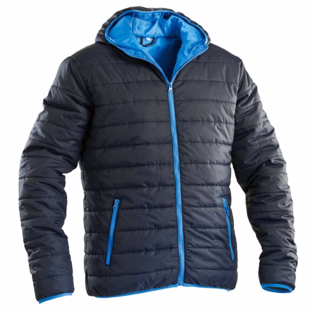 Piumino con cappuccio, fodera e cerniera in contrasto, 2 tasche inferiori chiuse con cerniera, fondo manica e polsini elasticizzati