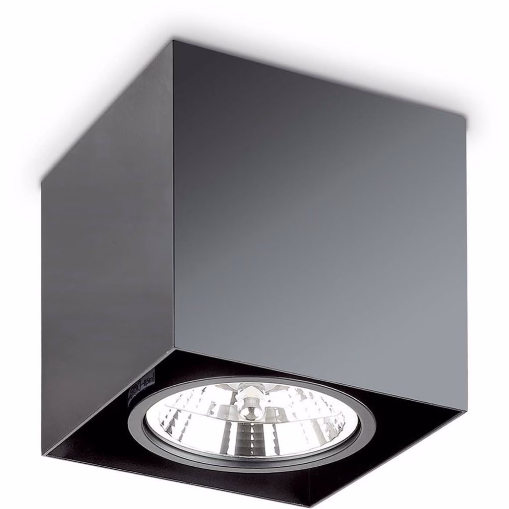 Corpo luce in metallo con sezione quadra. Nero all'interno e nero all'esterno. Diffusore interno orientabile. L 15 x H 15 x P 15 cm GU10 max 1 x 50W Lampadina inclusa IP20
