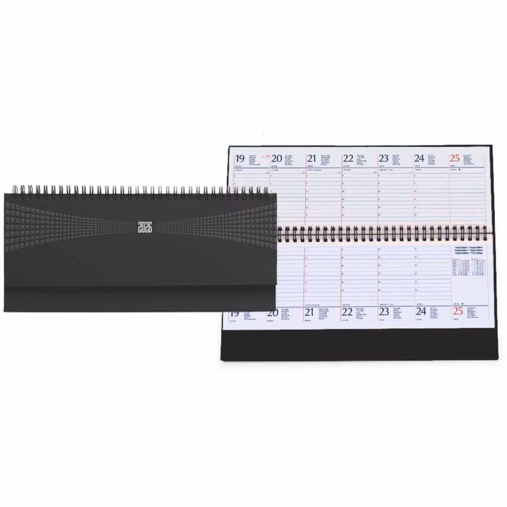 Agenda da tavolo con rilegatura a spirale metallica - copertina rigida in materiale Matra - 128 pagine versione settimanale (stessa settimana su due pagine) stampate a 2 colori su carta usomano bianca da 70 g/m2 - rubrica telefonica - edizione multilingue - formato fogli cm 30x11,5 - formato esterno cm 30x15