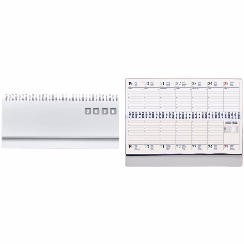 Agenda da tavolo con rilegatura a spirale metallica - copertina in polipropilene traslucido - 128 pagine versione settimanale (stessa settimana su due pagine) stampate a 2 colori su carta usomano bianca da 70 g/m2 - rubrica telefonica - edizione multilingue - formato fogli cm 30x11,5 - formato esterno cm 30x15