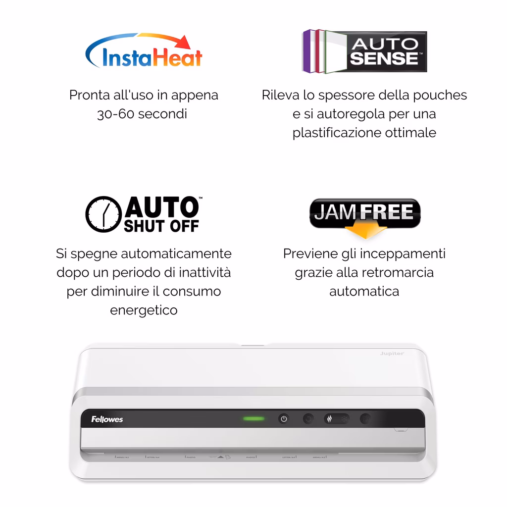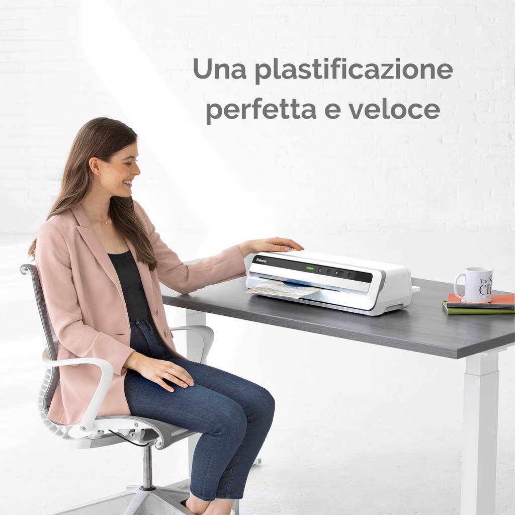 Plastifica una pouche A3 in appena 17 secondi. Prestazioni di velocità migliorate ad ogni settaggio di spessore. Riscaldamento rapido in 60 secondi con Tecnologia InstaHeat. Rileva automaticamente lo spessore della pouche e setta la velocità ottimale di plastificazione per risultati perfetti. Il Sensore di Pulizia avverte quando è necessario pulire i rulli, per plastificazioni sempre perfette. Controllo avanzato della pouche con mini guida luminosa: rileva potenziali inceppamenti e manda automaticamente in retromarcia. Grandi vassoi richiudibili in entrata e uscita per guidare la pouche dallinizio alla fine.