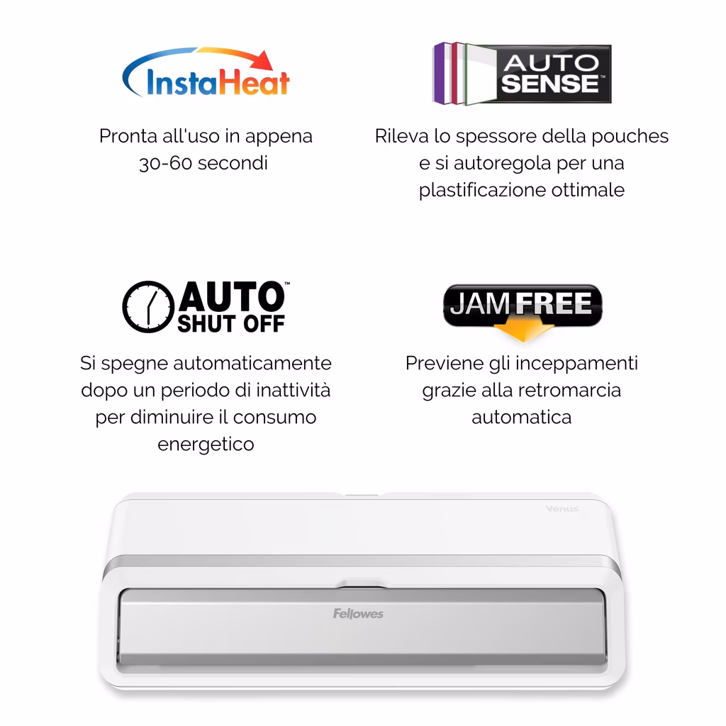 Ultra veloce! Plastifica una pouche A4 in appena 10 secondi! Prestazioni di velocità migliorate ad ogni settaggio di spessore. Riscaldamento rapido in 30-60 secondi con Tecnologia InstaHeat. Possibilità di scegliere tra plastificazione alta qualità e maggiore velocità con il settaggio Pro. Rileva automaticamente lo spessore della pouche e setta la velocità ottimale di plastificazione per risultati perfetti. Il Sensore di Pulizia avverte quando è necessario pulire i rulli, per plastificazioni sempre perfette. Controllo avanzato della pouche con mini guida luminosa: rileva potenziali inceppamenti e manda automaticamente in retromarcia. Grandi vassoi richiudibili in entrata e uscita per guidare la pouche dall'inizio alla fine.
