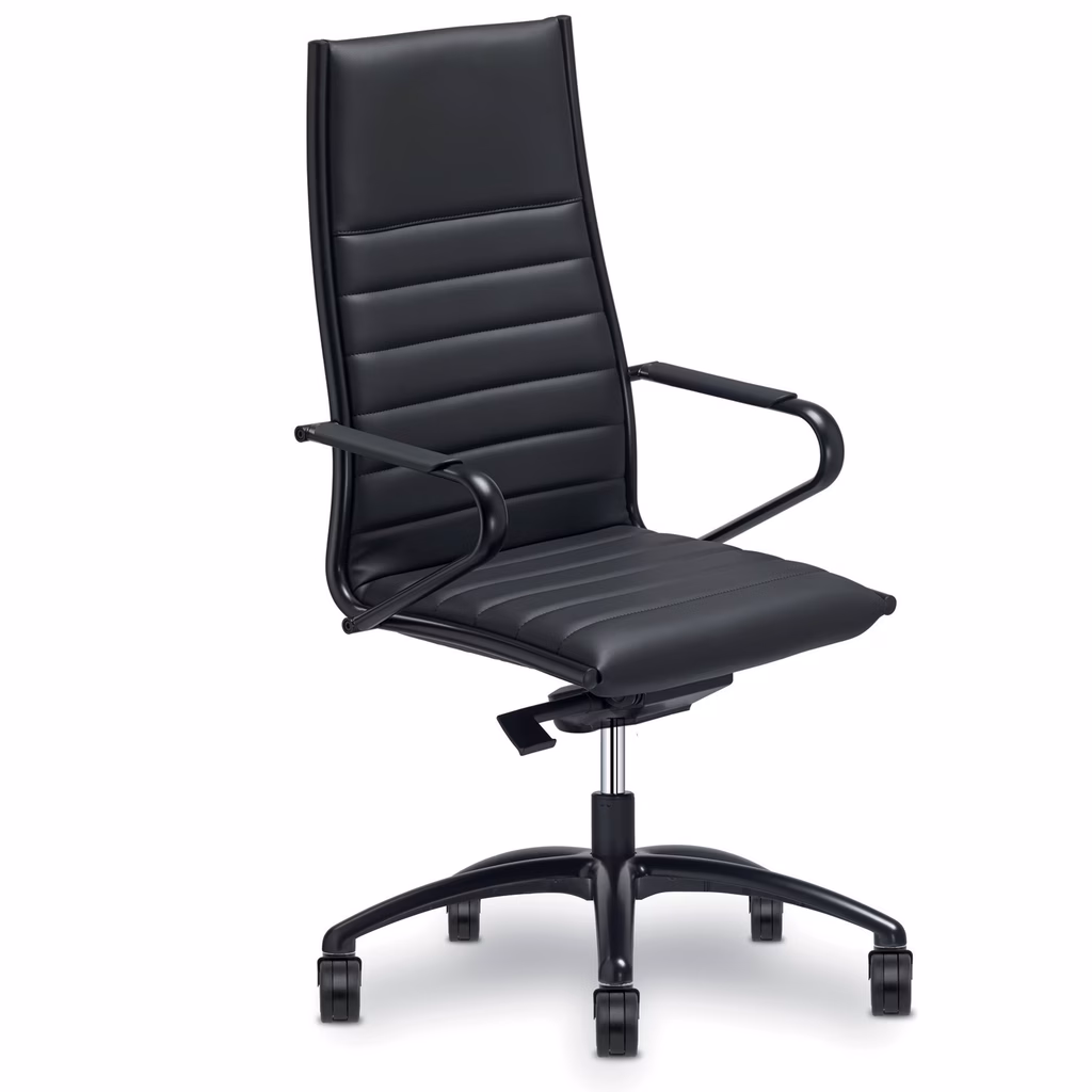 Estetica raffinata. La collezione Classic arreda lo spazio ufficio con sedute direzionali con schienale alto, sedute manageriali e meeting, caratterizzate da un design essenziale. Il telaio, in acciaio cromato o verniciato nero opaco, è completato dal basamento a cinque razze disponibile nelle finiture alluminio lucido e alluminio nero opaco. Nella versione nera copribracciolo tappezzato. Ruote gommate frenate (nella versione con struttura nera ruote di design cave). Movimento regolato da meccanismo oscillante con regolatore di tensione in funzione del peso dell'utilizzatore. Proposta con rivestimenti in pelle Panama oppure in ecopelle Nx. Garanzia 5 anni