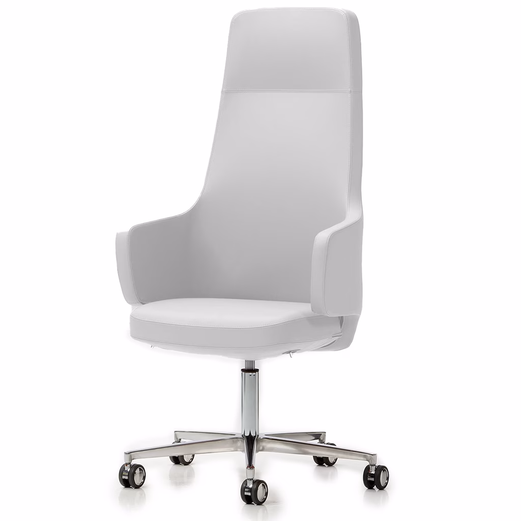 Direzionale nella versione con schienale alto. Imbottiture in poliuretano stampato a freddo autoestinguente. Braccioli integrati allo schienale. Struttura interna del sedile in legno certificato Fsc. Meccanismo synchron multiblocco con traslatore e base a cinque razze in alluminio lucido su ruote piroettanti gommate autofrenanti Ø 65mm cromate. Tramite supplemento è possibile prevedere il supporto lombare integrato nello schienale oppure prevederla con il meccanismo synchron autopesante. RIVESTIMENTI Proposta in tinta unita con vera pelle e tramite supplemento nella versione bicolor.