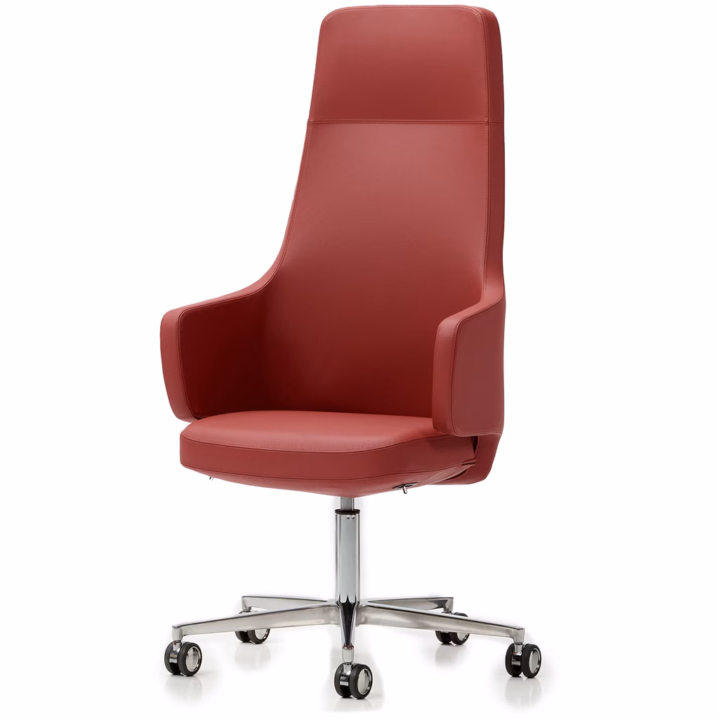 Direzionale nella versione con schienale alto. Imbottiture in poliuretano stampato a freddo autoestinguente. Braccioli integrati allo schienale. Struttura interna del sedile in legno certificato Fsc. Meccanismo synchron multiblocco con traslatore e base a cinque razze in alluminio lucido su ruote piroettanti gommate autofrenanti Ø 65mm cromate. Tramite supplemento è possibile prevedere il supporto lombare integrato nello schienale oppure prevederla con il meccanismo synchron autopesante. RIVESTIMENTI Proposta in tinta unita con vera pelle e tramite supplemento nella versione bicolor.