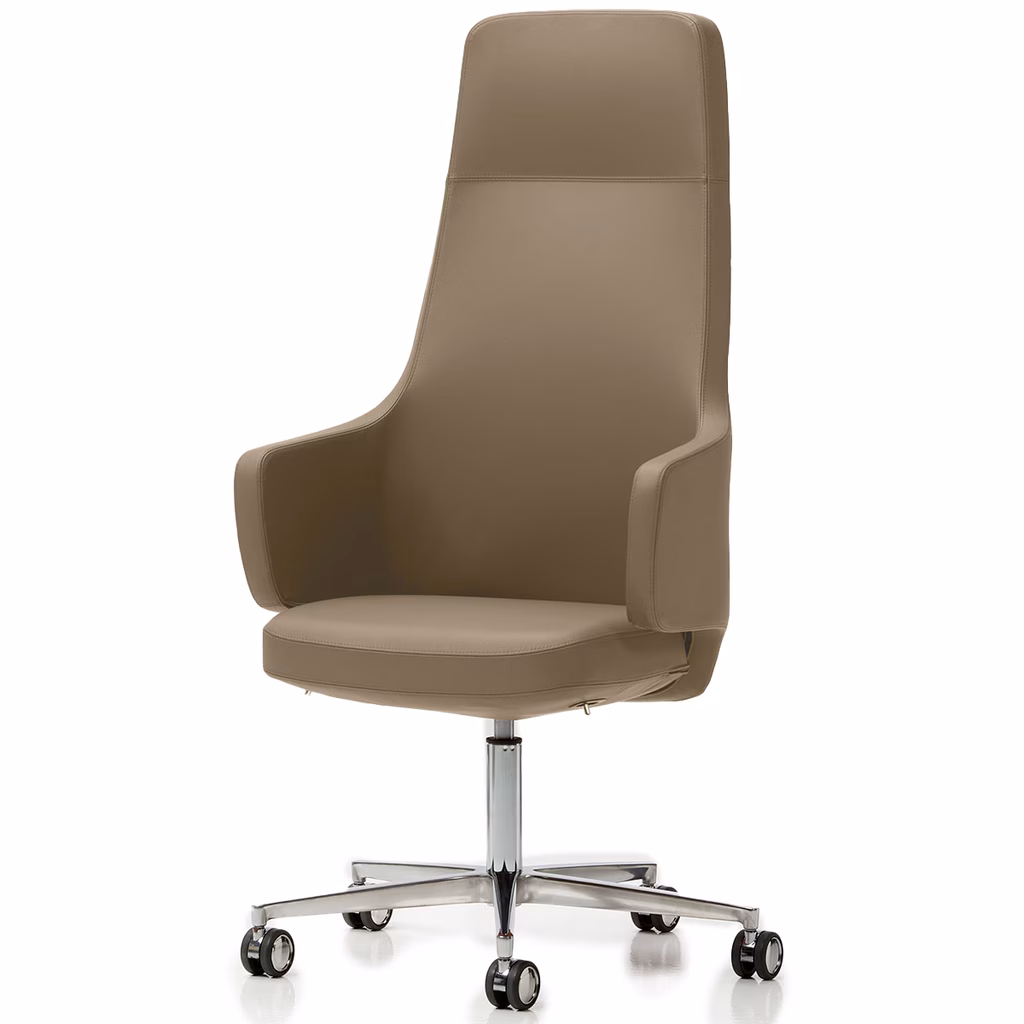 Direzionale nella versione con schienale alto. Imbottiture in poliuretano stampato a freddo autoestinguente. Braccioli integrati allo schienale. Struttura interna del sedile in legno certificato Fsc. Meccanismo synchron multiblocco con traslatore e base a cinque razze in alluminio lucido su ruote piroettanti gommate autofrenanti Ø 65mm cromate. Tramite supplemento è possibile prevedere il supporto lombare integrato nello schienale oppure prevederla con il meccanismo synchron autopesante. RIVESTIMENTI Proposta in tinta unita con vera pelle e tramite supplemento nella versione bicolor.