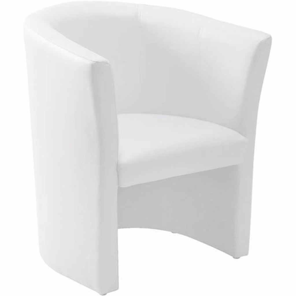 Poltrona con imbottitura in resina poliuretanica densità 30 kg/mc. Dimensioni LxpxH cm 70x62x78. Rivestimento in ecopelle colore bianco