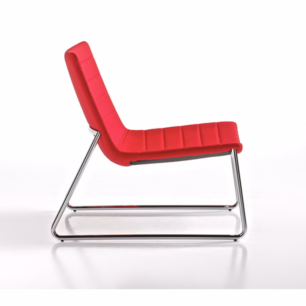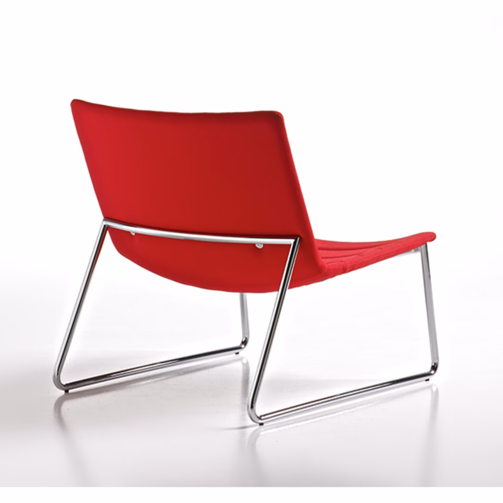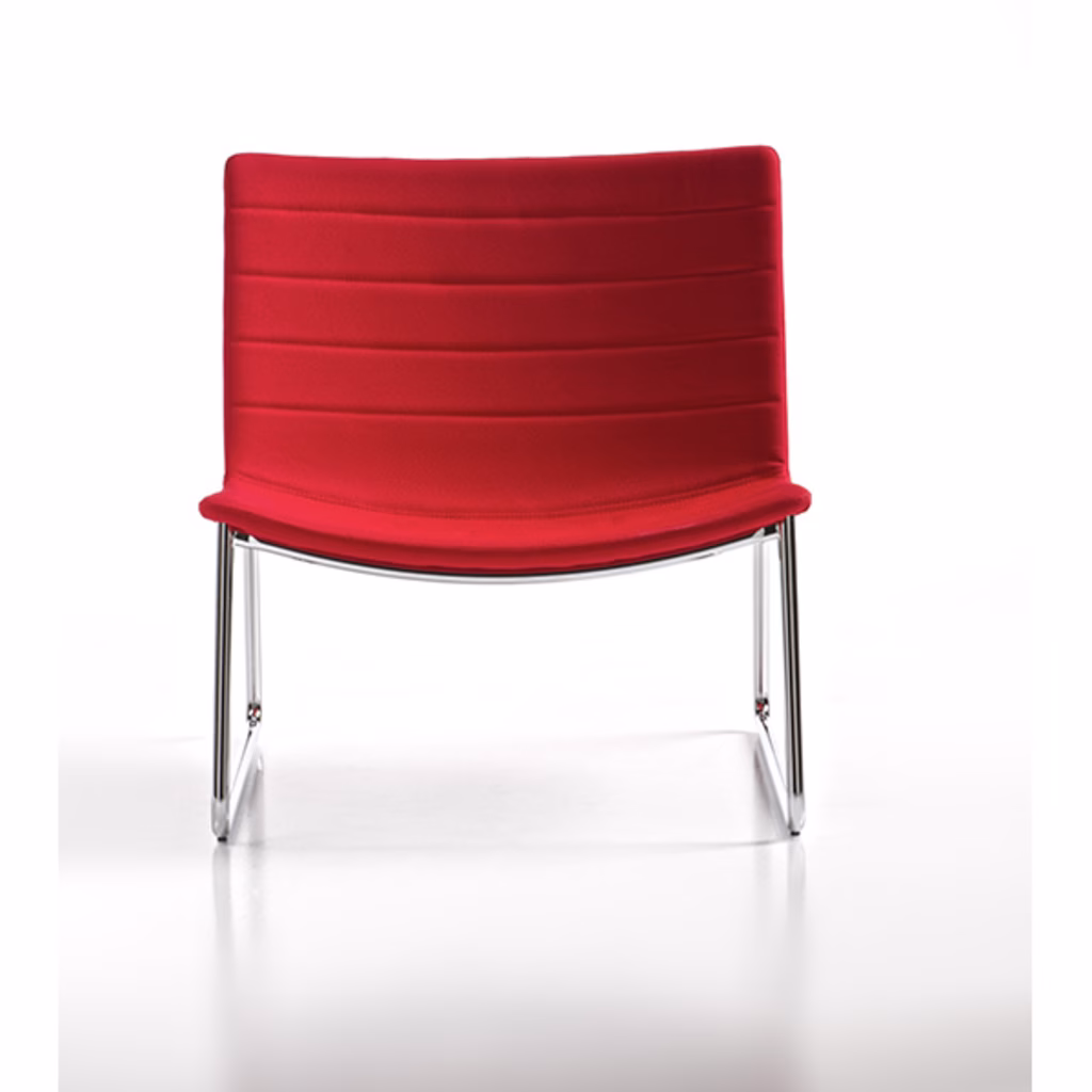 Caratterizzata da una linea essenziale, di spiccata versatilità, ideale per la casa, il contract e lufficio. Monoscocca in multistrato di faggio, imbottita in poliuretano espanso, rivestita con cuciture trasversali. Versione poltrona lunge su telaio a slitta cromato. Abbinabile alla versione sedia appartenente alla stessa collezione. Rivestimento in ecopelle ignifuga Planet (test usura 100.000 cicli Martindale) colore rosso