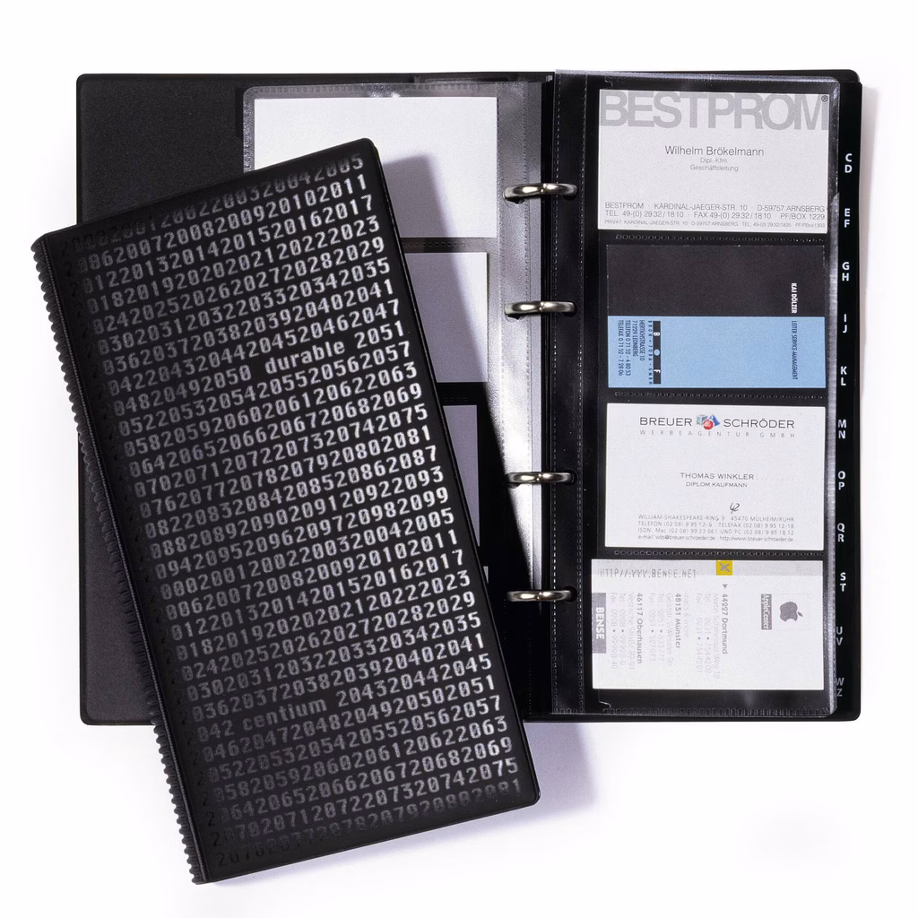 Elegante e robusto porta biglietti da visita a 4 anelli - copertina con finitura satinata e decorazione numerica: dotato di 25 buste per 200 biglietti da visita formato 90x57 mm - include indice alfabetico a 12 tasti - capacità espandibile con il set di estensione per 80 biglietti da visita cod. PU04247