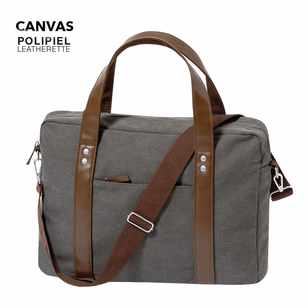 Borsa portadocumenti a tracolla dal design intramontabile, realizzata in resistente tela da 475 g/m² - cinghie in similpelle e pratica tracolla regolabile - interno imbottito con scomparto per laptop fino a 15" - include una pratica tasca esterna - dimensioni LxPxH cm 40x9x30 - peso g 490 - presentata in una polybag individuale riciclata