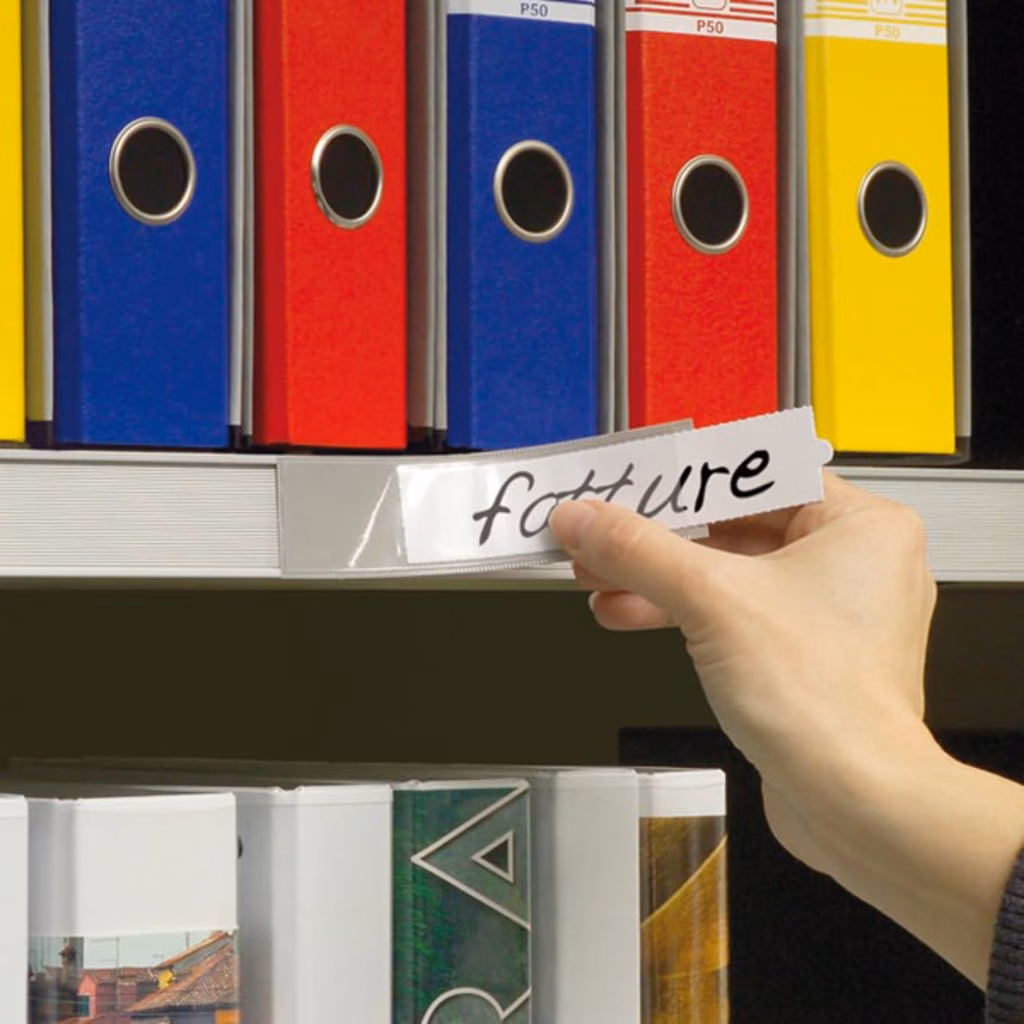 Porta etichette autoadesive in PVC trasparente con fondo grigio ed etichette intercambiabili. Facili da applicare su cassetti, ripiani, scatole, raccoglitori, valigie, barattoli e bottiglie.