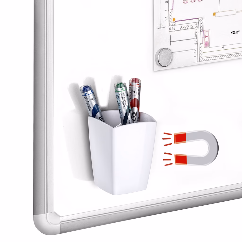 Realizzato in robusto polistirene antiurto riciclabile. Applicabile direttamente sulle lavagne magnetiche. Due compartimenti, capacità totale 10 marcatori per lavagne. Garanzia 5 anni.