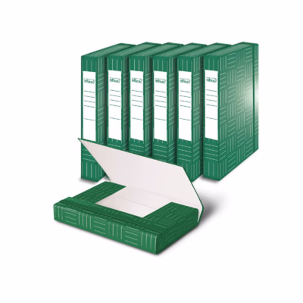 Scatola a 3 alette in pesante cartone rivestito (certificato FSC®) - dorso e lembi cordonati - chiusura con elastico piatto - superficie sottoposta a trattamento di vetrificazione per un'alta resistenza alla polvere e all'umidità - dorso scrivibile con pennarello permanent