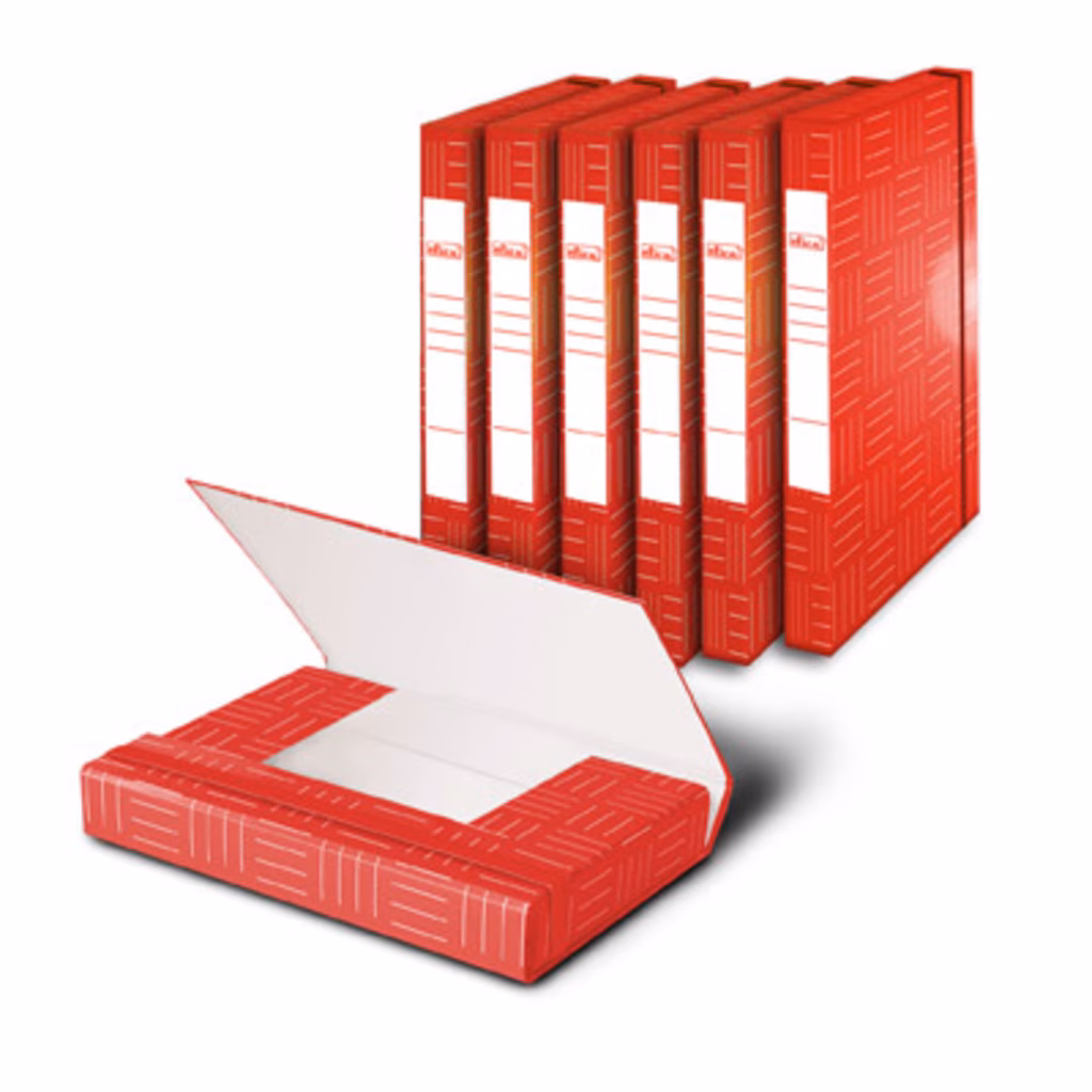 Scatola a 3 alette in pesante cartone rivestito (certificato FSC®) - dorso e lembi cordonati - chiusura con elastico piatto - superficie sottoposta a trattamento di vetrificazione per un'alta resistenza alla polvere e all'umidità - dorso scrivibile con pennarello permanent
