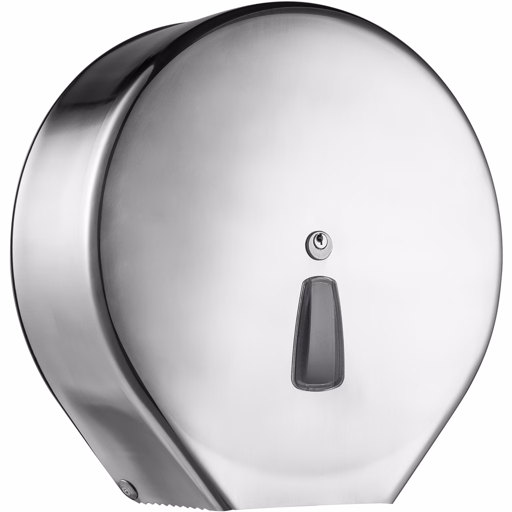 Dispenser Inox lucido MARPLAST JUMBINOX MAXI per carta igienica maxi jumbo - a muro con tasselli in dotazione, può contenere un rotolo di carta igienica diametro max 280 mm. - serratura metallica a chiave