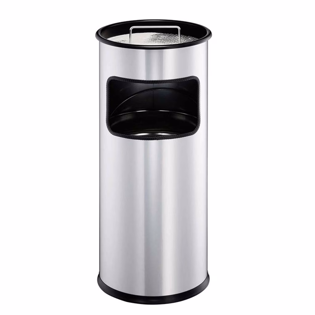Pratico posacenere a colonna con sabbia e cestino, realizzato in acciaio verniciato con polveri epoxy-poliestere antigraffio - Ideale per le zone fumatori in aree interne o aree esterne protette dalle intemperie - Dotato di contenitore interno che facilita lo smaltimento dei rifiuti e di una griglia con maniglia utile per rimuovere dalla sabbia cenere e mozziconi evitando il contatto con le mani - La base è dotata di quattro piedini antiscivolo