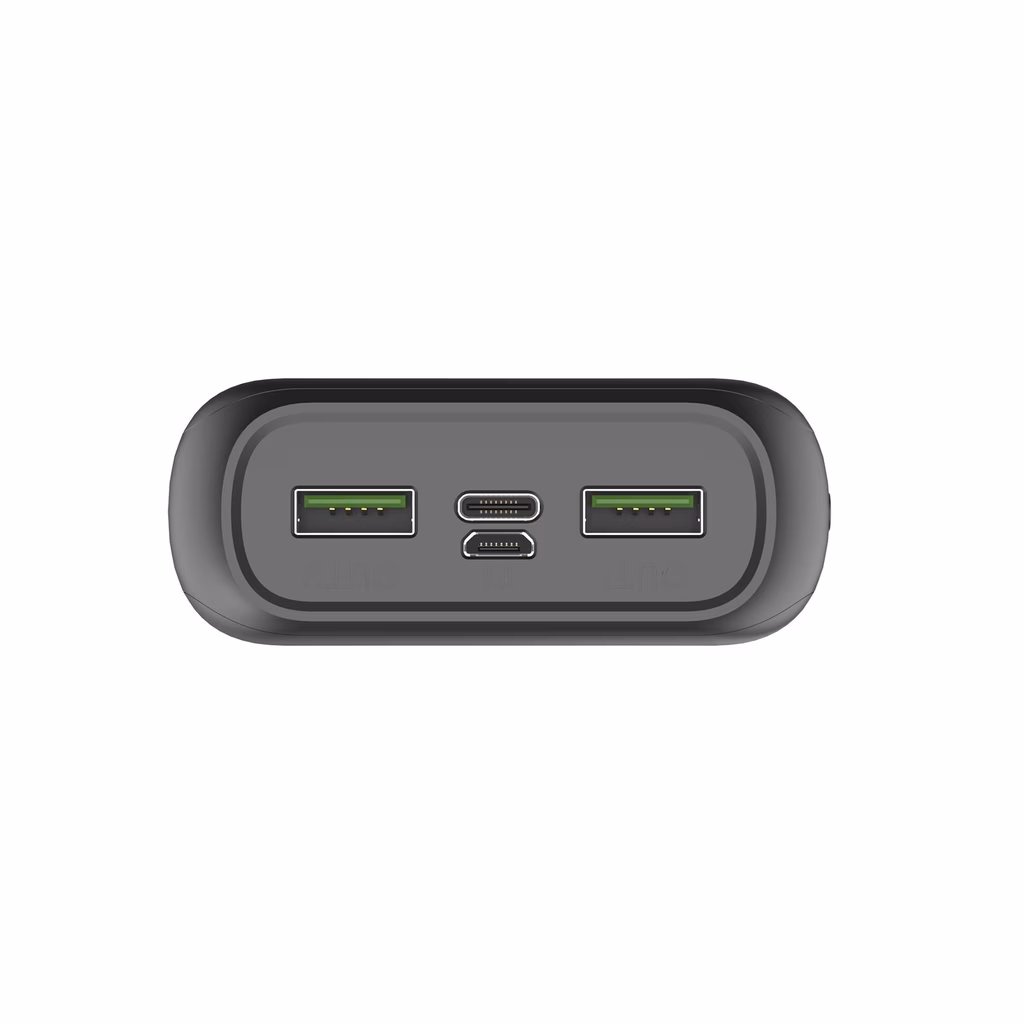 E' provvista di porte USB con output totale di 2 Ampere/ 10 Watt per la ricarica dei dispositivi, di un connettore Micro Usb per la ricarica del Power Bank e di un connettore USB-C che fa sia da Input che da Output.