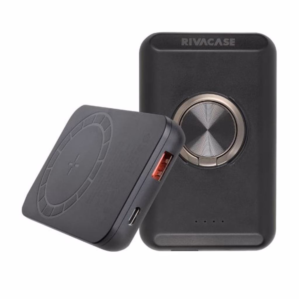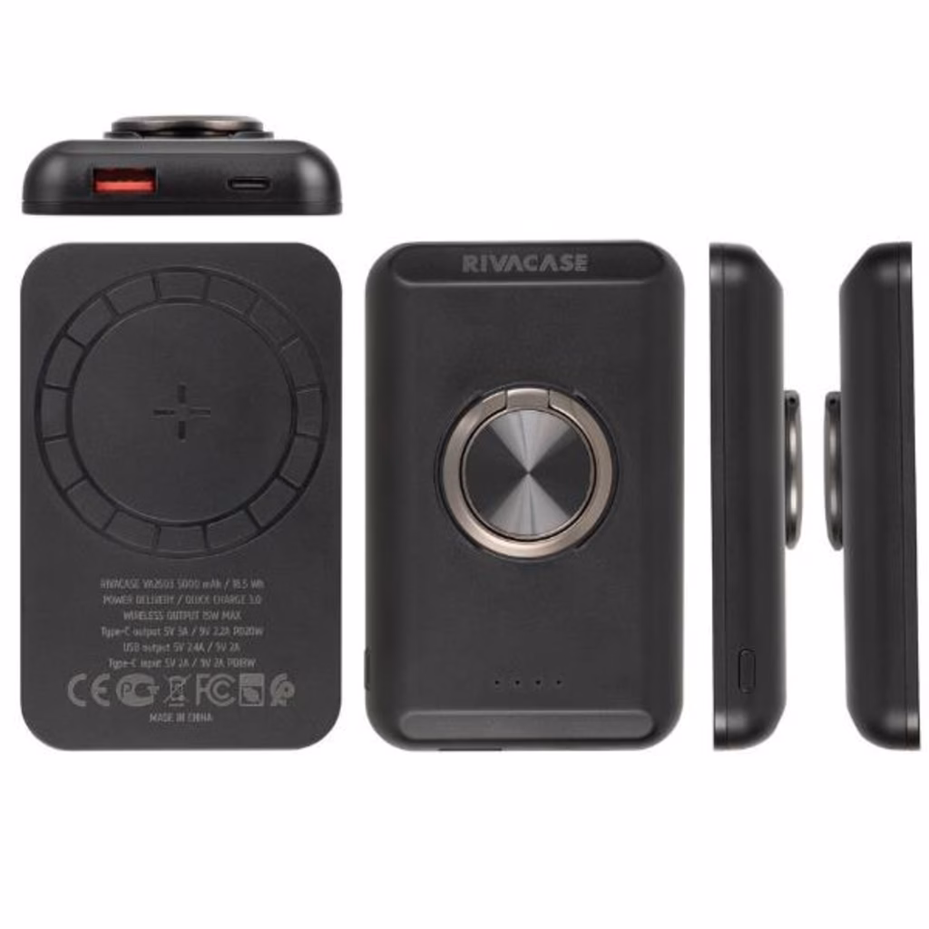 RIVACASE VA2603 Magsafe Qi WIRELESS 15W + QC/PD 22.5W portable batteryProduct Features: 5000 mAh capacity rechargeable battery Up to 15W wireless charging Magsafe magnetic alignment compatible with the latest iPhone models 22.5W maximum output power Fast Charge Iphone - supports 20W charging mode LED indicator Protection for over-charging, over-discharging, overload and short circuit Automatic turn on/off Biult-in holder ringSpecifications:Li- Polymer battery: 3.7V 5000 mAh 18.5 Wh Input: Type-C 5V 2A / 9V 2A Wireless output: Up to 15W Output: USB-A 5V 4.5A / 9V 2AUSB-C 5V 2A / 9V 2.2A USB-A - USB-C ?able included Size: 100x63x15 mmWeight: 140 g