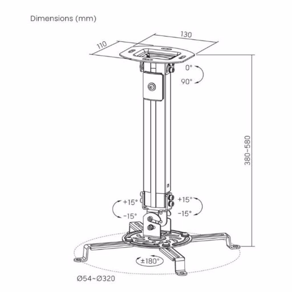 Uno dei punti di forza principali di questo supporto è la regolazione dell altezza, variabile da 380 a 580 mm, che permette di adattare il proiettore in base alle specifiche esigenze di visione. Questa caratteristica lo rende perfetto sia per soffitti bassi che alti, offrendo la massima libertà nella scelta della posizione ottimale del dispositivo. Inoltre, il supporto consente una rotazione completa di 360°, combinata con un inclinazione di ±15°, garantendo la possibilità di orientare il fascio di proiezione in qualsiasi direzione, per un allineamento preciso e immagini sempre perfette. Anche nel caso di soffitti inclinati, il Prometheus assicura una installazione stabile e sicura, mantenendo un orientamento corretto del proiettore senza difficoltà.