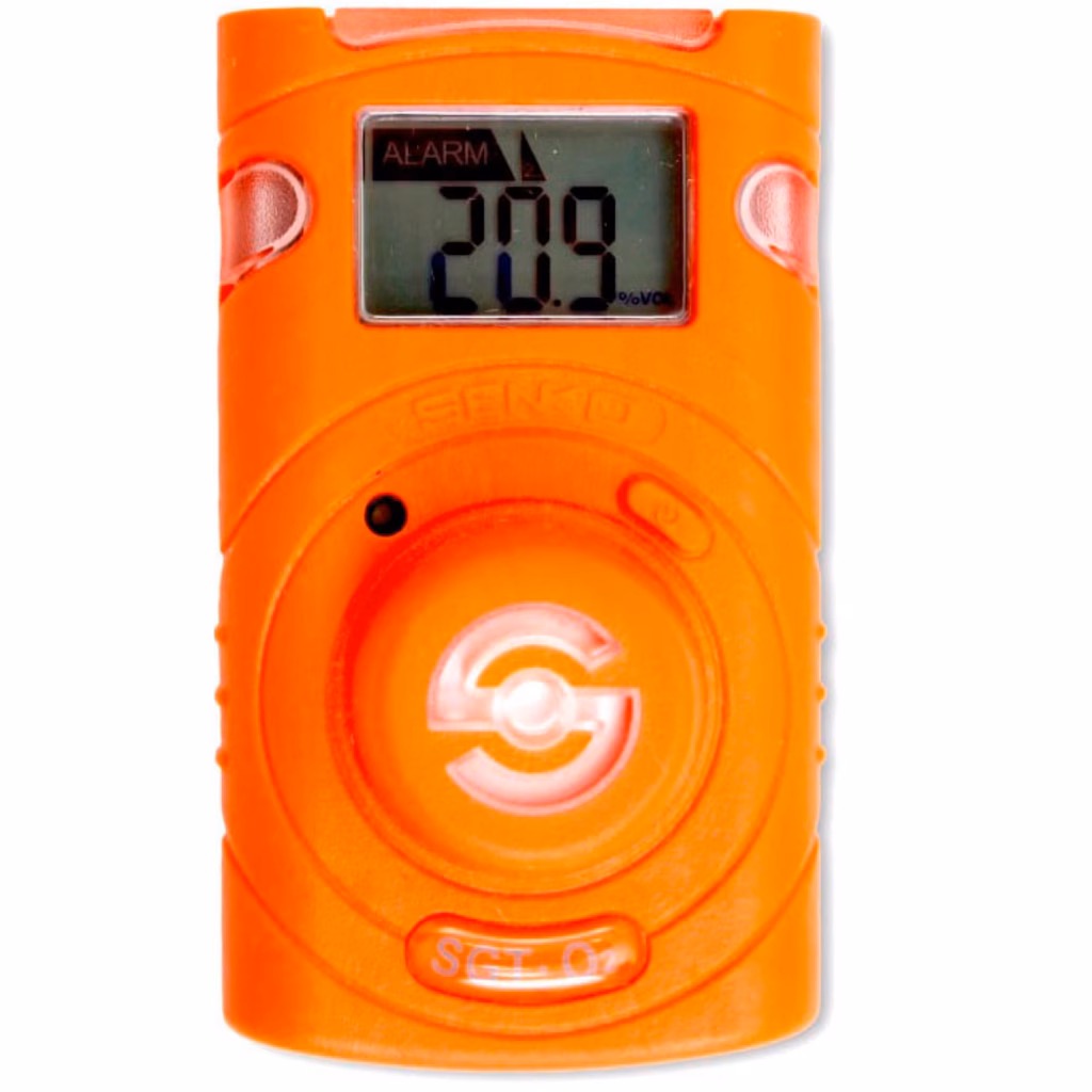 Rilevatore monogas portatile SGT O2 colore arancione, 2 anni di autonomia senza necessità di sostituire il sensore, lettura in tempo reale per il rilevamento di uno dei seguenti gas:ossigeno O2, monossido di carbonio CO, solfuro di Idrogeno H2S, biossido di zolfo SO2, diidrogeno H2, ammoniaca NH3, chermo LCD di facile lettura - menù integrato per la consultazione di informazioni, include un software per la configurazione dei valori del dispositivo e la programmazione degli allarmi, notifica di allerta attraverso luci rosse, vibrazione e suono, certificato ATEX per lavori in ambienti esplosivi, possibilità di scaricare i dati degli ultimi 30 allarmi, dispositivo robusto e resistente a polvere e sostanze liquide IP67, colore arancione per una rapida identificazione visiva del dispositivo