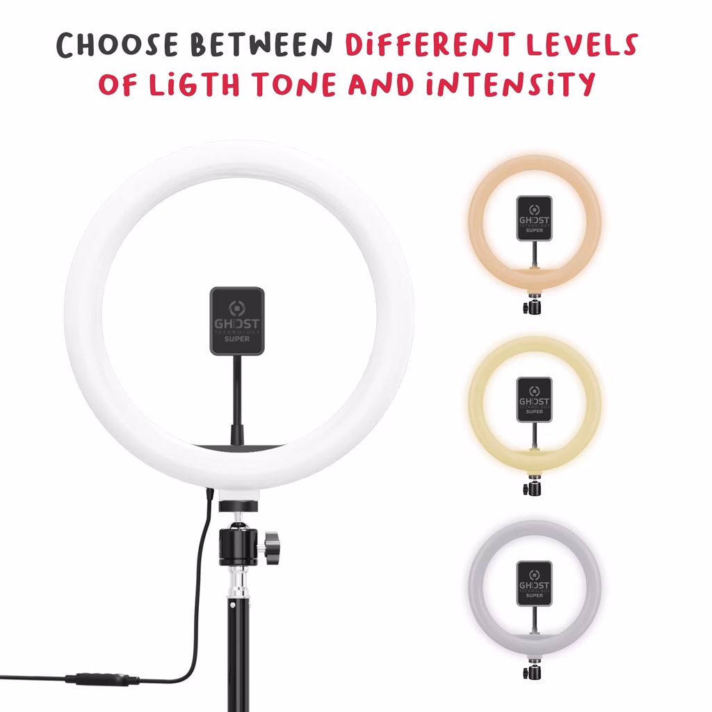 CLICKGHOSTUSB è regolabile in altezza, ed è possibile modificare l intensità e la tonalità della luce grazie al telecomando posto sul cavo. Il ring light si alimenta grazie al cavo con connettore USB.