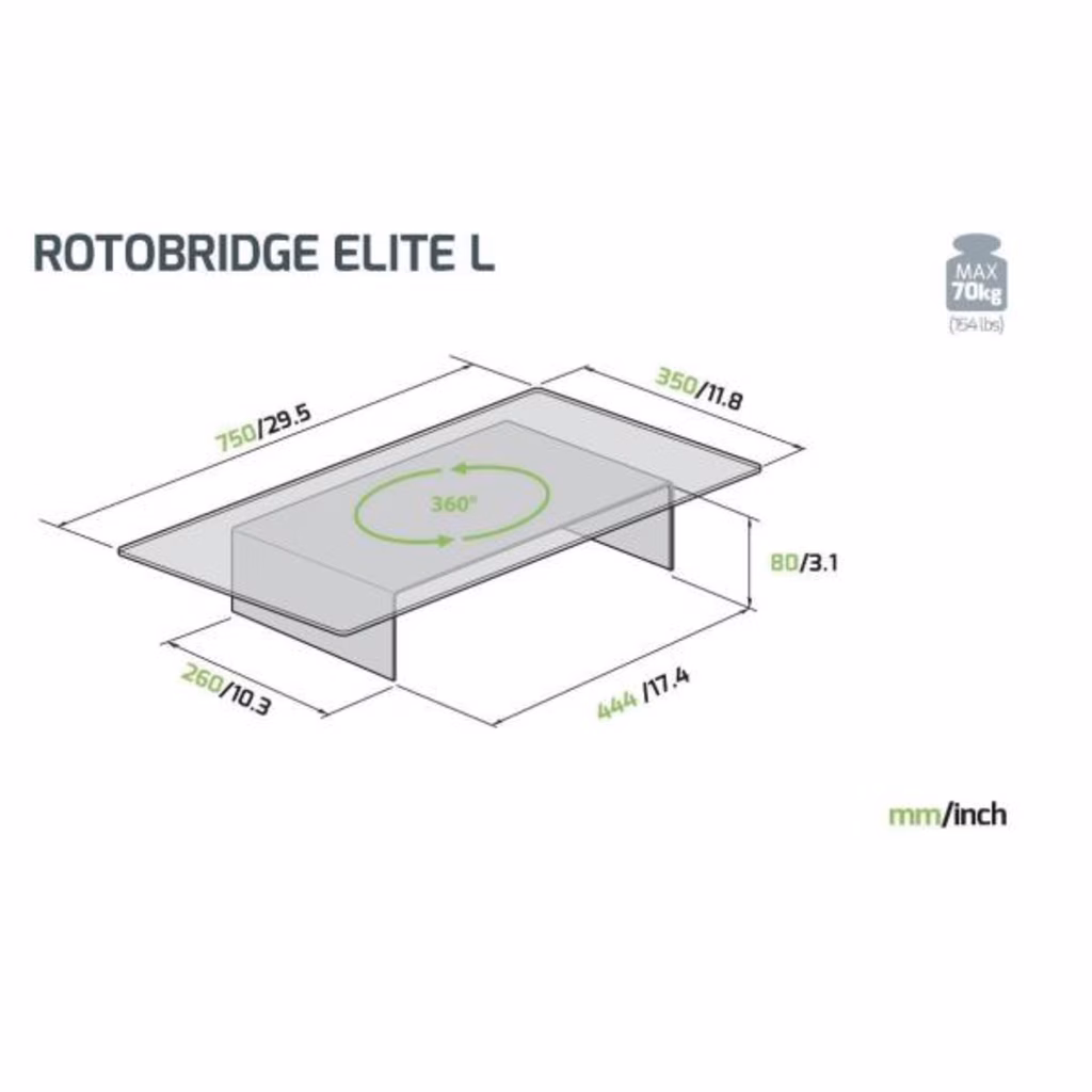 ?Rotobridge Elite L è composto da una base in acciaio in grado di accogliere le periferiche audio-video e da un elegante piano in vetro temperato ruotabile 360° che permette di orientare la TV in qualsiasi direzione. Il prodotto ha una portata massima di 70Kg.