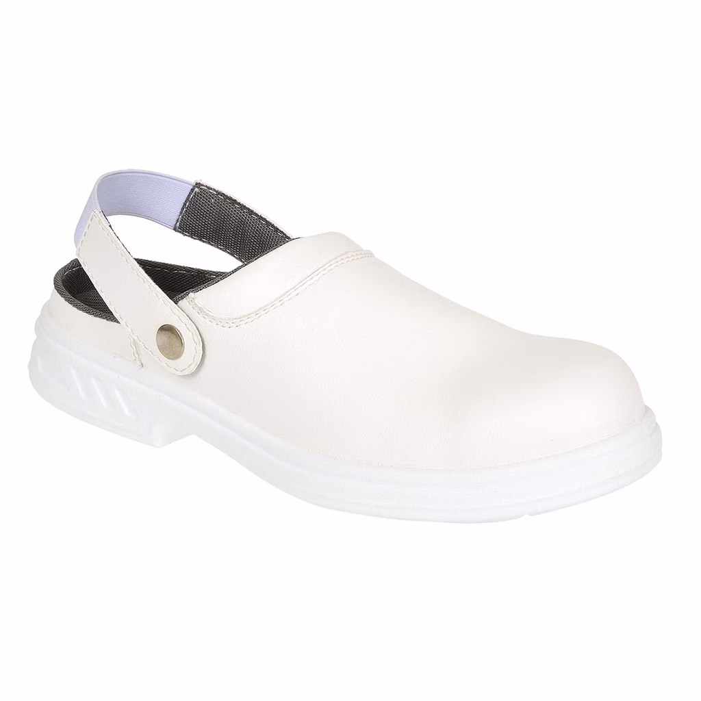 Scarpa leggera in microfibra in versione sandalo con strap staccabile sul retro. - Suola autopulente che previene la contaminazione incrociata - Colletto imbottito per un maggior comfort - Tomaia dal design lineare - Cinturino staccabile - Disponibile in taglie unisex - Lavabile in lavatrice a 30 °C - Adatto ai vegani - Disegnate per le stanze asettiche - mediche e alimentari - Certificato CE - Marcato UKCA - Puntale in acciaio protettivo - Calzatura antistatica - Tallone con assorbimento energia - Tomaia resistente all'acqua per prevenire la penetrazione dell'acqua