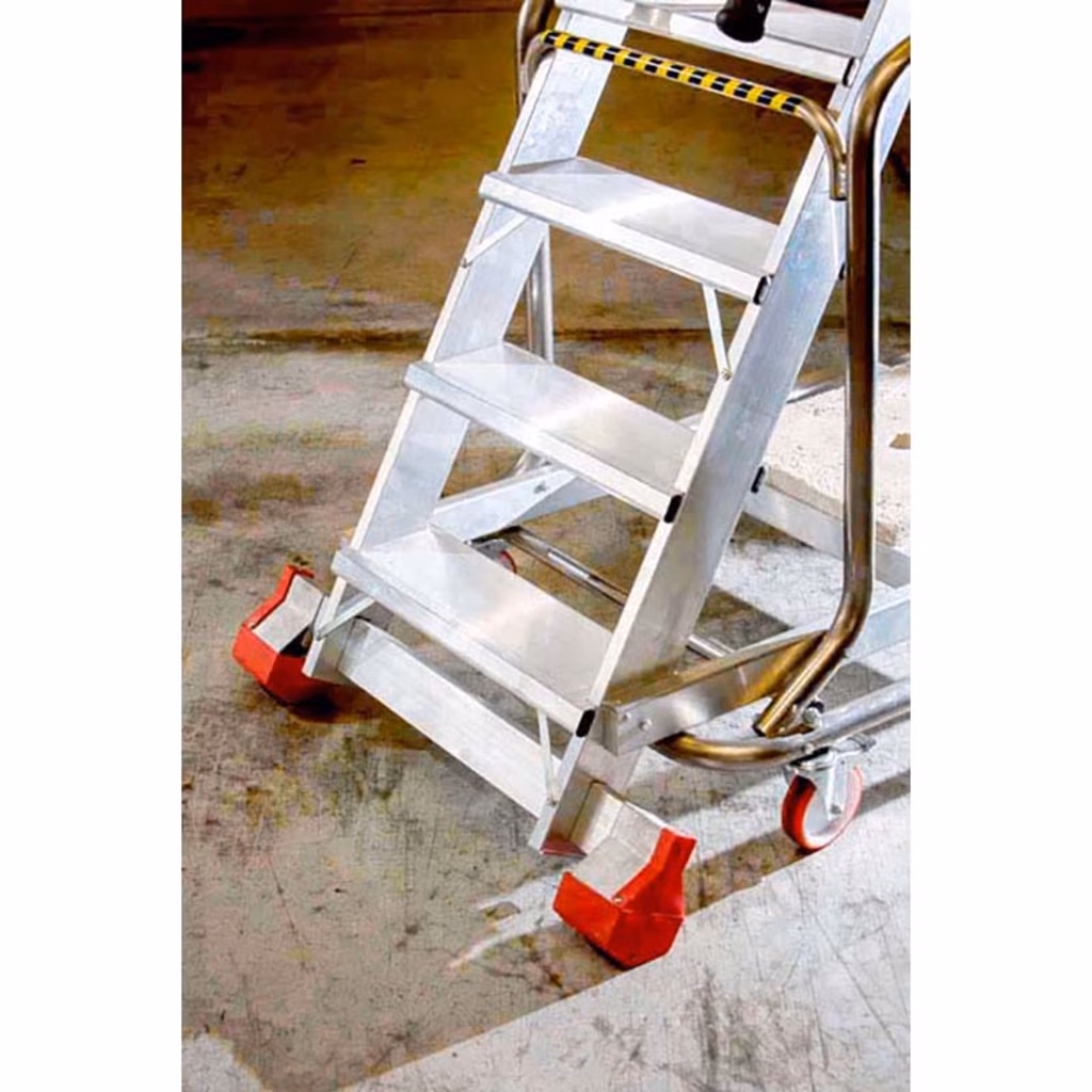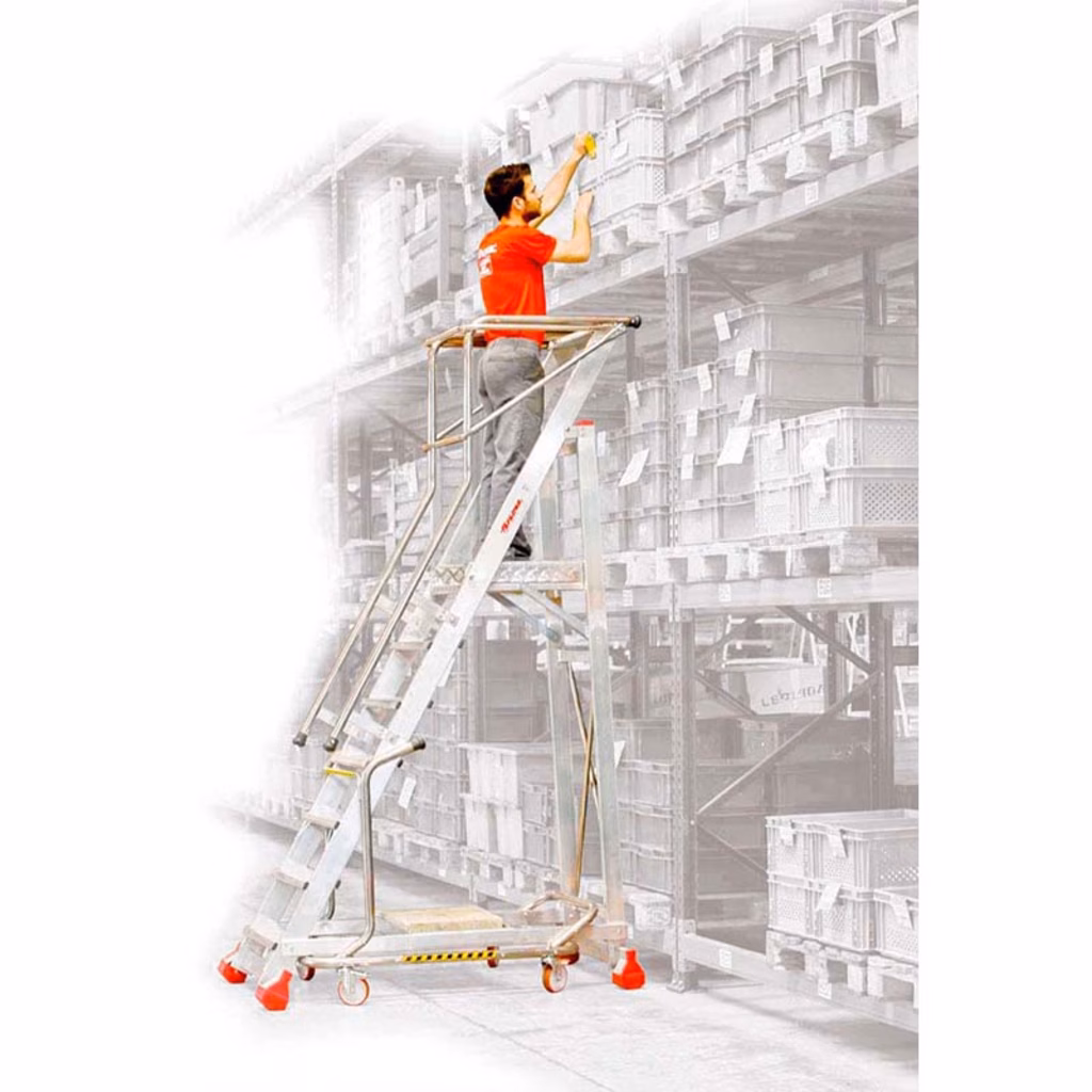 Disponibile da 4 a 15 gradini - Altezza massima di lavoro 5,4 m - Costruita in base alla norma EN 131.7, supera il test di ribaltamento laterale rendendo la piattaforma sicura per lavorare - Supera i test di resistenza di oltre 50.000 cicli di lavoro - Testata dal Politecnico di Milano, ogni scala è dotata del certificato di conformità e collaudo - Il comodo piano di lavoro antiscivolo in alluminio mandorlato (52x62) dona all'operatore ampio spazio di manovra - Il corrimano laterale in tubolare di alluminio sagomato consente all'operatore una presa sicura - La croce stabilizzatrice nell'asse posteriore migliora la stabilità della scala - COMFORT: Comodi gradini da 15 cm, L'inclinazione della scala di 60° rende la salita e la discesa agevole, Spostamento comodo e rapido grazie alle ruote del sistema Sicur-Stop.