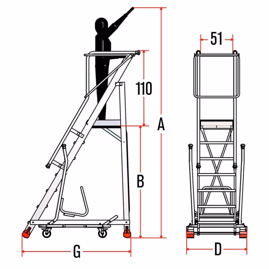 Disponibile da 4 a 15 gradini - Altezza massima di lavoro 5,4 m - Costruita in base alla norma EN 131.7, supera il test di ribaltamento laterale rendendo la piattaforma sicura per lavorare - Supera i test di resistenza di oltre 50.000 cicli di lavoro - Testata dal Politecnico di Milano, ogni scala è dotata del certificato di conformità e collaudo - Il comodo piano di lavoro antiscivolo in alluminio mandorlato (52x62) dona all'operatore ampio spazio di manovra - Il corrimano laterale in tubolare di alluminio sagomato consente all'operatore una presa sicura - La croce stabilizzatrice nell'asse posteriore migliora la stabilità della scala - COMFORT: Comodi gradini da 15 cm, L'inclinazione della scala di 60° rende la salita e la discesa agevole, Spostamento comodo e rapido grazie alle ruote del sistema Sicur-Stop.