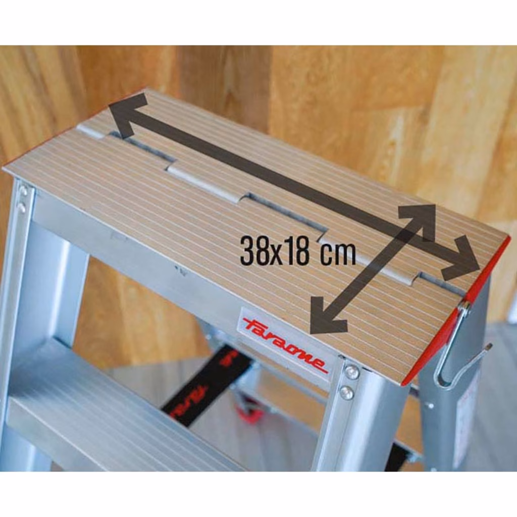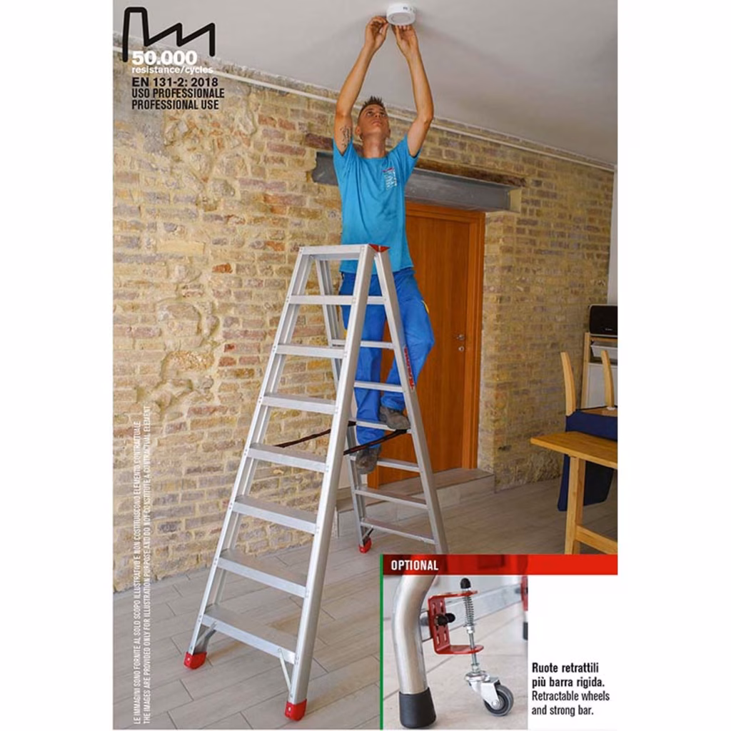 Disponibile da 2+2 a 12+12 gradini - Altezza massima di lavoro 4,0 m - Supera i test di resistenza di oltre 50.000 cicli di lavoro della norma EN 131-2 - Ogni scala è dotata del certificato di conformità e collaudo - Fissaggio dei gradini con tecnologia aeronautica garantiti 10 anni che allungano di almeno il doppio la vita della scala - Tamponi antiscivolo maggiorati aderiscono bene a diversi tipi di pavimentazione - Larghi montanti in alluminio anodizzato - COMFORT: Profondità gradino antiscivolo da 8 cm, Chiusa occupa poco spazio (16 cm), comoda da riporre in ogni angolo.
