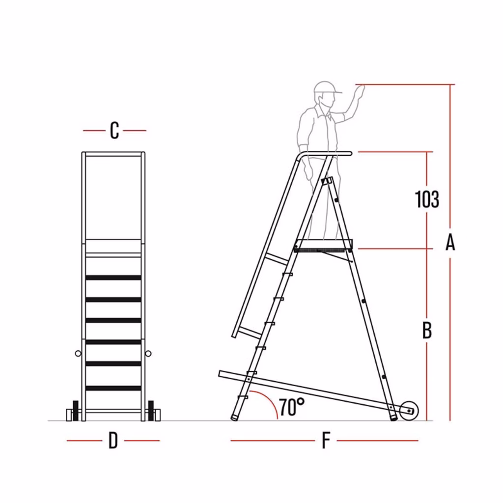 Disponibile da 6 a 10 gradini - Altezza massima di lavoro 4,16 m - Costruita secondo la norma EN 131.2, supera i test di resistenza di oltre 50.000 cicli di lavoro - Testata dal Politecnico di Milano, ogni scala è dotata del certificato di conformità e collaudo - Area di lavoro protetta grazie alle cinghie di sicurezza anti-apertura accidentale - Il comodo piano di lavoro antiscivolo in alluminio mandorlato (52x62) permette all'operatore di lavorare in sicurezza - Il corrimano laterale in tubolare di alluminio sagomato consente all'operatore una presa sicura - La croce stabilizzatrice nell'asse posteriore migliora la stabilità della scala - COMFORT: Comodi gradini antiscivolo da 10 cm, L'inclinazione della scala di 70° rende la salita e la discesa agevole, Spostamento comodo e rapido grazie alle ruote posteriori, Ingombro ridotto e facile trasporto grazie alle cerniere di acciaio che permettono alla scala di richiudersi