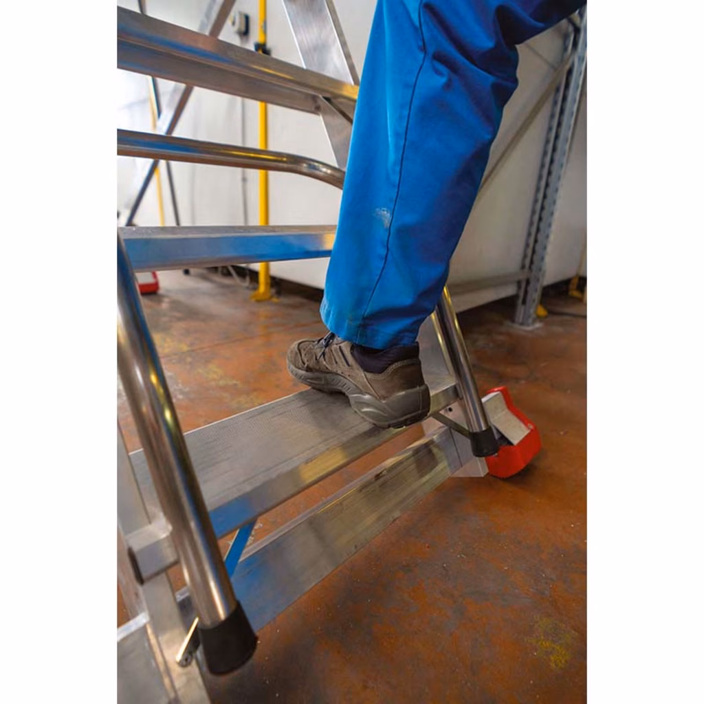 Disponibile da 3 a 17 gradini - Altezza massima di lavoro 5,9 m - Costruita in base alla norma EN 131.7, supera il test di ribaltamento laterale rendendo la piattaforma sicura per lavorare - Supera i test di resistenza di oltre 50.000 cicli di lavoro - Testata dal Politecnico di Milano, ogni scala è dotata del certificato di conformità e collaudo - Il comodo piano di lavoro antiscivolo in alluminio mandorlato (52x62) dona all'operatore ampio spazio di manovra - Il corrimano laterale in tubolare di alluminio sagomato consente all'operatore una presa sicura - Lo stabilizzatore telescopico permette una perfetta livellatura della scala alla pavimentazione - Il sistema di protezione permette un facile accesso e garantisce un lavoro in totale sicurezza - COMFORT: Comodi gradini da 15 cm, L'inclinazione della scala di 60° rende la salita e la discesa agevole, Spostamento comodo e rapido grazie alle ruote posteriori, Stabilizzatori richiudibili e ingombro ridotto per un facile trasporto