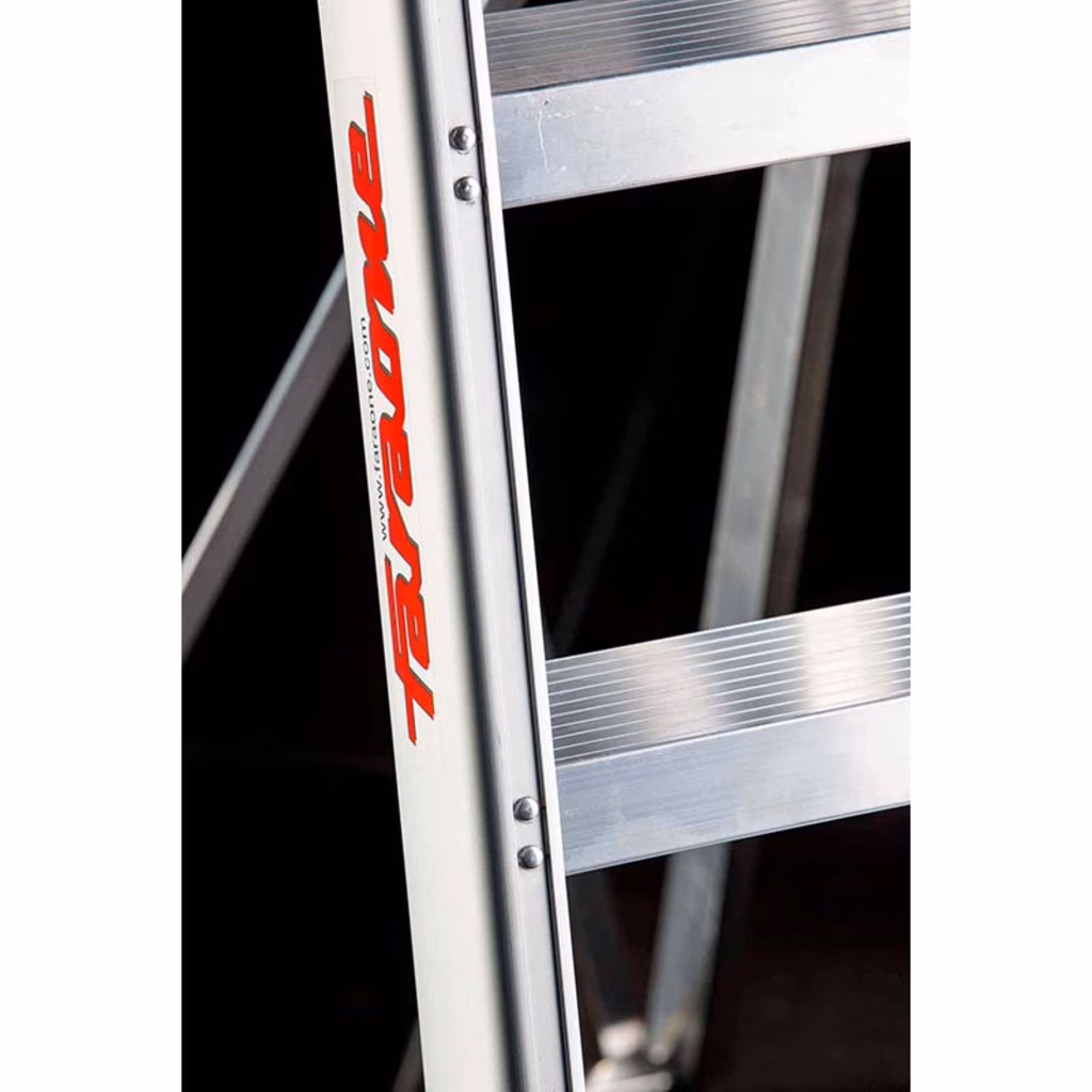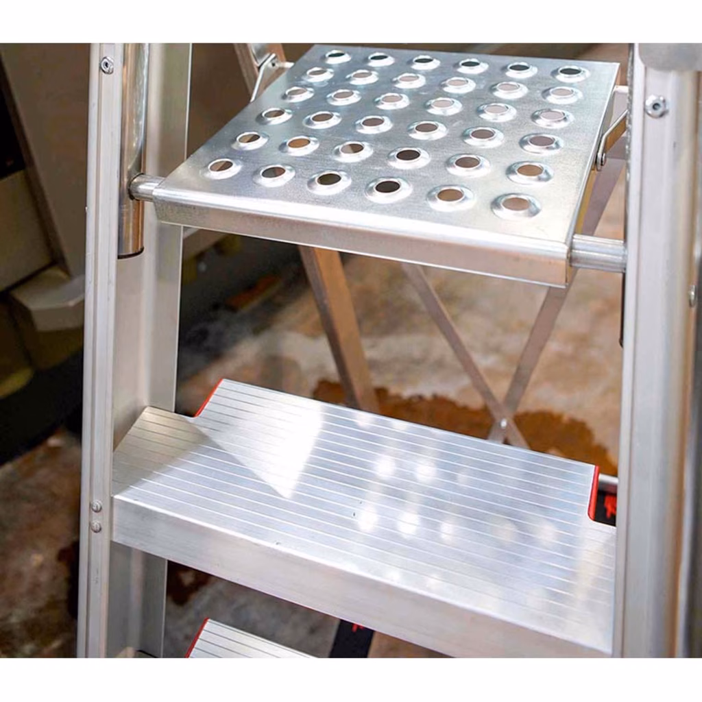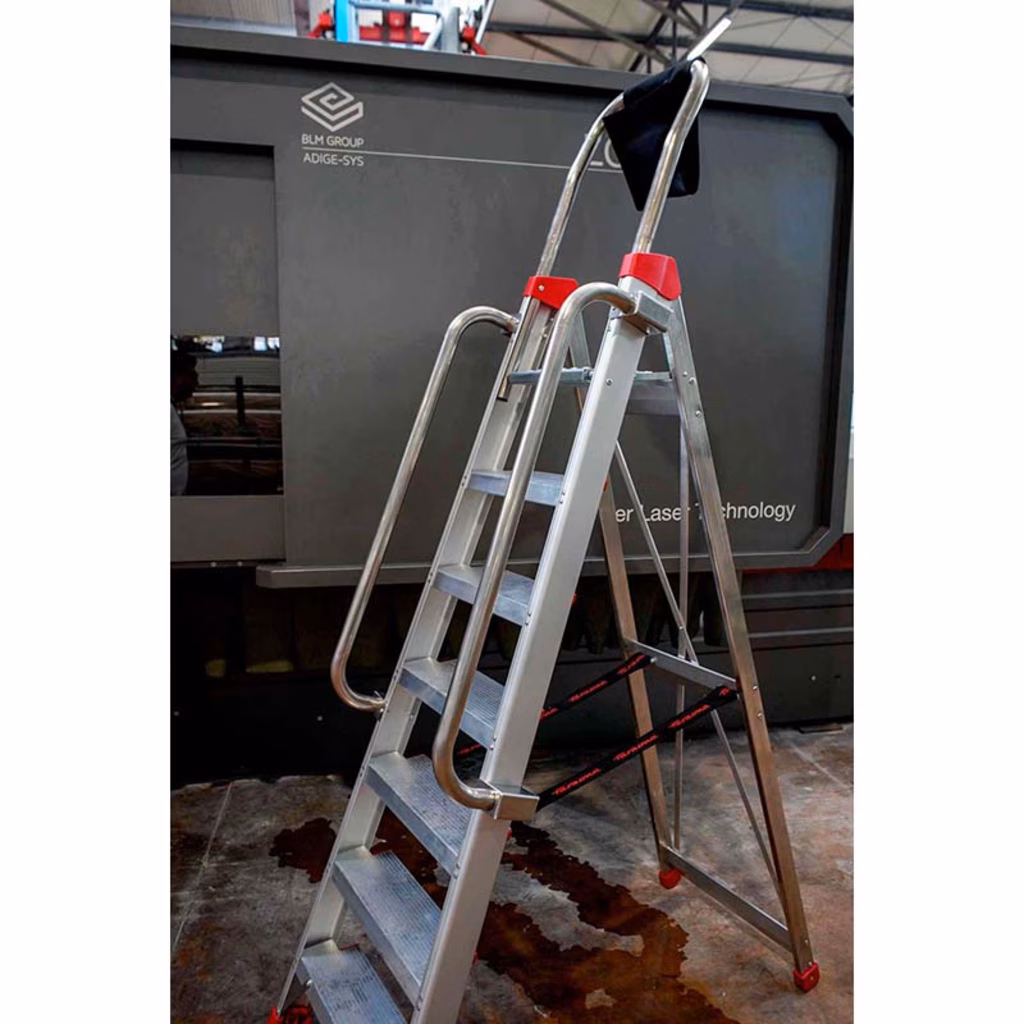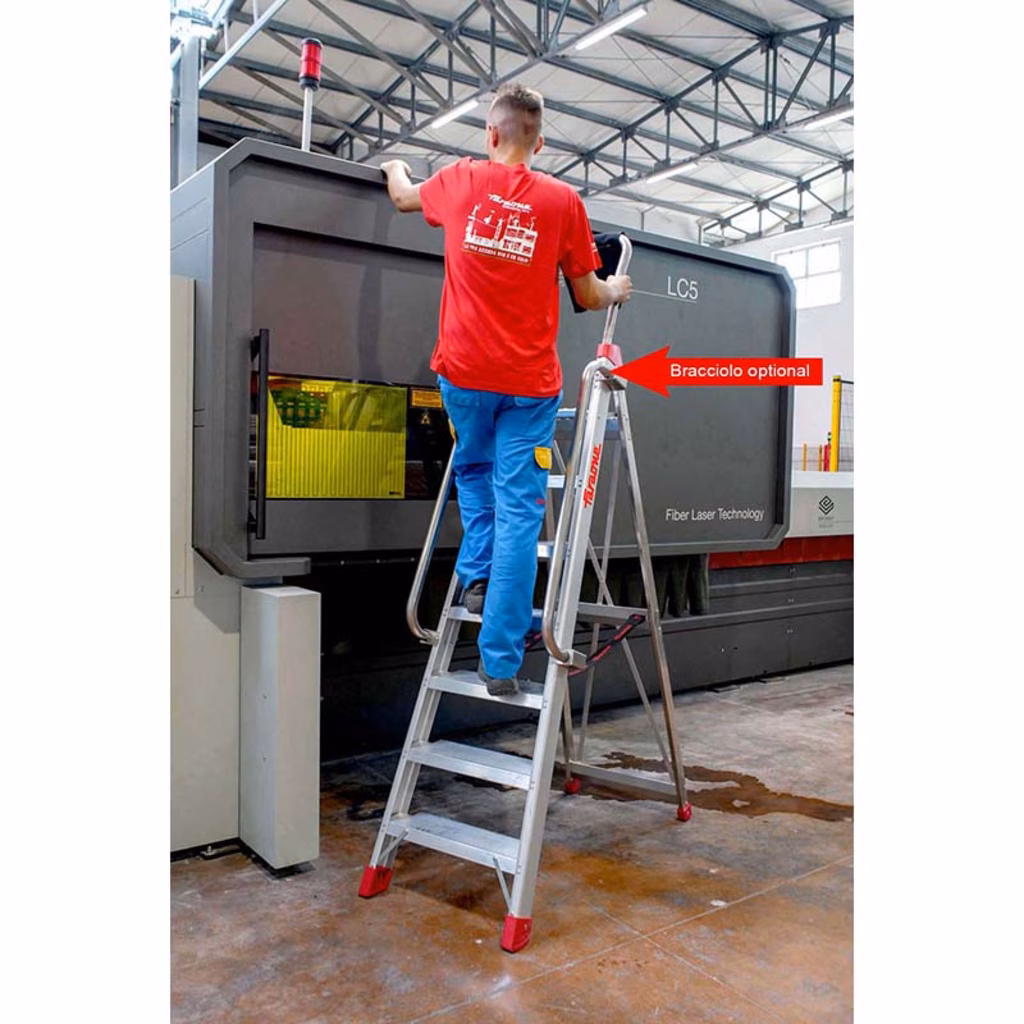 Una scala dal design curato, fine ed elegante e senza spigoli vivi (free-sharp edges). I montanti laterali in alluminio anodizzato non macchiano le mani, consentendone l'utilizzo anche in situazioni che richiedono speciale attenzione alla pulizia (es. montaggio tende). Disponibile da 3 a 12 gradini - Portata massima: fino a 7 gradini 200 kg, da 8 gradini in poi 150 kg - Altezza di lavoro massima 4,5 m - Supera i test di resistenza di oltre 50.000 cicli di lavoro della norma EN 131-2. Ogni scala è dotata del certificato di conformità e collaudo - Larghi montanti in alluminio anodizzato. Per una salita più comoda e sicura, è possibile aggiungere i braccioli optional - Piano di lavoro in acciaio stampato antiscivolo - COMFORT: Comodo gradino antiscivolo da 13 cm, Ampia sacca portaoggetti consente di lavorare in comodità avendo tutto a portata di mano, Corrimano ergonomico (diametro 35 mm) per una presa sicura e ulteriore appoggio in altezza, Chiusa occupa poco spazio (16 cm), comoda da riporre in ogni angolo.