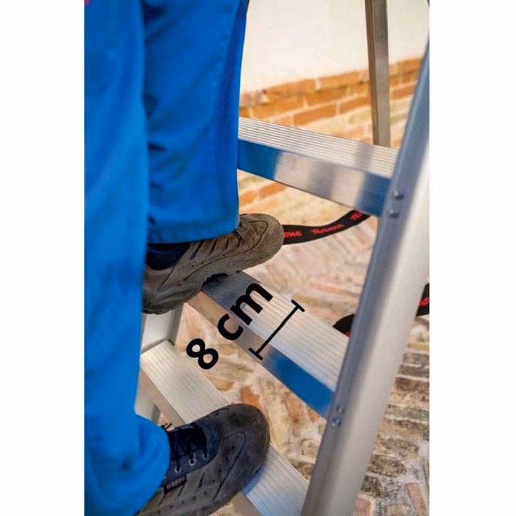 Scala in alluminio - gradino da cm 13 fissato con rivetti in acciaio da mm 5 ad alta resistenza - maggiore stabilità con le traverse di rinforzo agli angoli - pedana in acciaio antisdrucciolo mm 270x270 - sistema di stabilizzazione a croce - Comoda e robusta sacca portaoggetti - rispetta la normativa EN 131-1.2