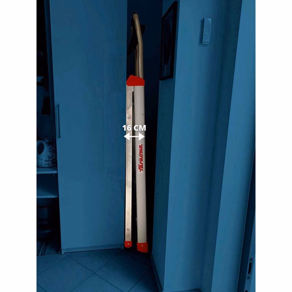 Scala in alluminio - gradino da cm 13 fissato con rivetti in acciaio da mm 5 ad alta resistenza - maggiore stabilità con le traverse di rinforzo agli angoli - pedana in acciaio antisdrucciolo mm 270x270 - sistema di stabilizzazione a croce - Comoda e robusta sacca portaoggetti - rispetta la normativa EN 131-1.2