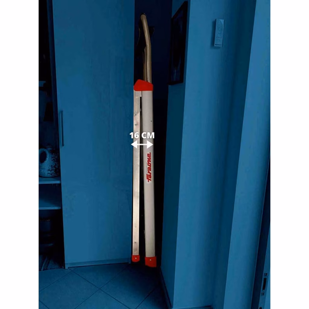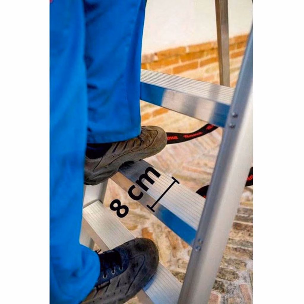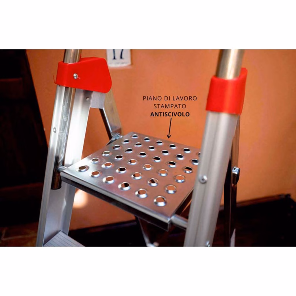Scala in alluminio - gradino da cm 13 fissato con rivetti in acciaio da mm 5 ad alta resistenza - maggiore stabilità con le traverse di rinforzo agli angoli - pedana in acciaio antisdrucciolo mm 270x270 - sistema di stabilizzazione a croce - Comoda e robusta sacca portaoggetti - rispetta la normativa EN 131-1.2