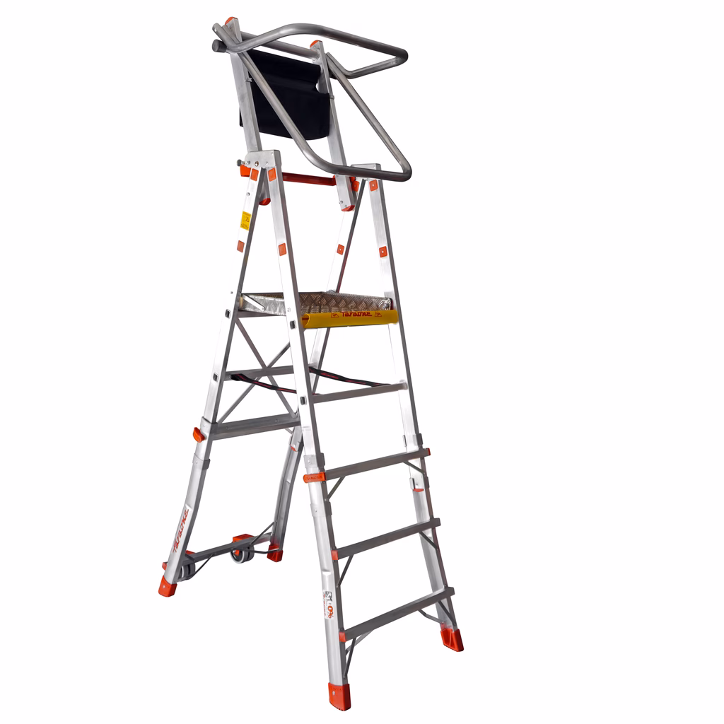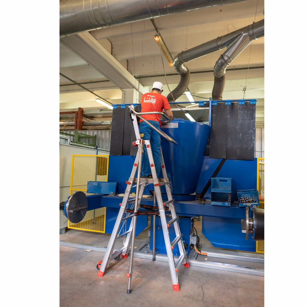 Disponibile da 3 a 5 gradini - Altezza massima di lavoro 4,2 m - Costruita in base alla norma EN 131.7, supera il test di ribaltamento laterale rendendola una piattaforma sicura per lavorare - Supera i test di resistenza di oltre 50.000 cicli di lavoro della norma EN 131.2 - Fissaggio dei gradini con tecnologia aeronautica garantiti 10 anni che allungano di almeno il doppio la vita della scala - Il comodo piano di lavoro antiscivolo in alluminio mandorlato (40x50) dona all'operatore ampio spazio di manovra - Lo stabilizzatore telescopico permette una perfetta livellatura della scala anche in versione a zoppo - Il sistema di protezione permette un facile accesso e garantisce un lavoro in totale sicurezza - Dotata di blocco di sicurezza per il bracciolo - Maggiore stabilità grazie alle traverse di rinforzo agli angoli - COMFORT: Ampia sacca portaoggetti consente di lavorare in comodità avendo tutto a portata di mano, Spostamento comodo e rapido grazie alle ruote posteriori, Gli stabilizzatori richiudibili e l'ingombro ridotto da chiusa favoriscono un facile trasporto