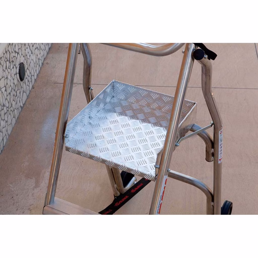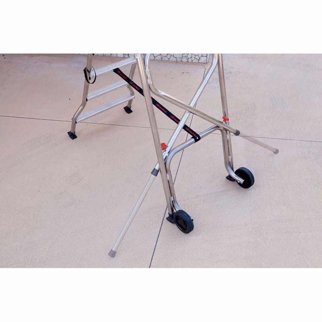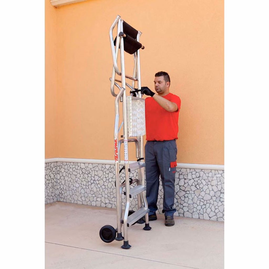 Disponibile da 3 a 6 gradini - Altezza massima di lavoro 3,2 m - rispetta i criteri di sicurezza sul lavoro del D.L. 81 - Costruita in base alla norma EN 131.7, supera il test di ribaltamento laterale rendendola una piattaforma sicura per lavorare - supera i test di resistenza di oltre 50.000 cicli di lavoro della norma EN 131.2 - Testata dal Politecnico di Milano, ogni scala è dotata del certificato di conformità e collaudo - Il comodo piano di lavoro antiscivolo in alluminio mandorlato (40x40) dona all'operatore ampio spazio di manovra - Il sistema di protezione permette un facile accesso e garantisce un lavoro in totale sicurezza - Dotata di stabilizzatori nei modelli PL5 e PL6 - COMFORT: Ampia sacca portaoggetti consente di lavorare in comodità avendo tutto a portata di mano, Spostamento comodo e rapido grazie alle ruote posteriori, Ingombro ridotto da chiusa per poterla trasportare agevolmente