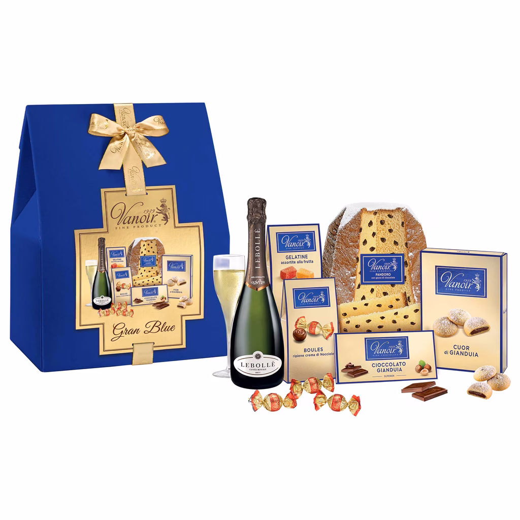 Particolare scatola a cuspide Gran Blue in Velluto blu e fiocco in raso - Pandoro con gocce di cioccolato Vanoir 750 g - Bottiglia spumante Millesimato brut Le Bollè 11% vol - 750 ml - Tavoletta cioccolato gianduia Vanoir 100 g - Astuccio pasticcini cuor di gianduia Vanoir 140 g - Confezione boules alla nocciola Vanoir 100 g - Confezione Gemme morbide gelées alla frutta Vanoir 100 g