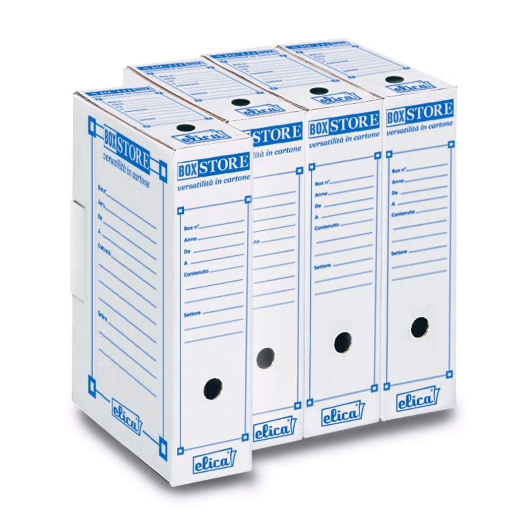 Scatola per l'archivio in robusto cartone bianco con stampa colorata su tutti i lati - fornita stesa per il minimo ingombro, si monta facilmente a incastro