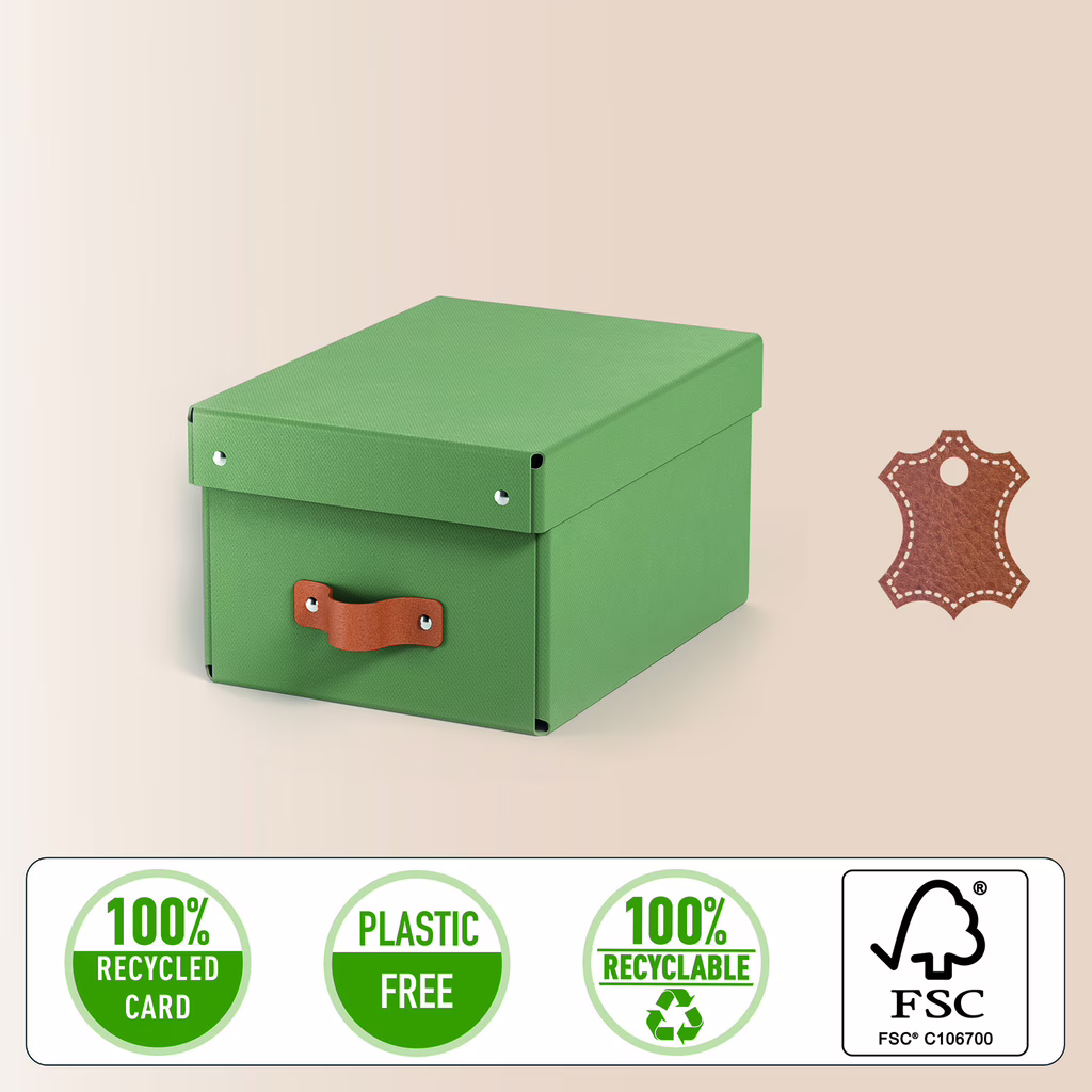 Set di due scatole portaoggetti con coperchio, realizzate in cartone 100% riciclato. Vengono fornite piatte e si assemblano facilmente e rapidamente. Sono impilabili per ottimizzare lo spazio e perfette per conservare documenti e altri oggetti. Dotate di una maniglia in pelle per facilitarne lestrazione da scaffali e mobili. Possono essere completamente smontate per un riciclo totale a fine utilizzo.