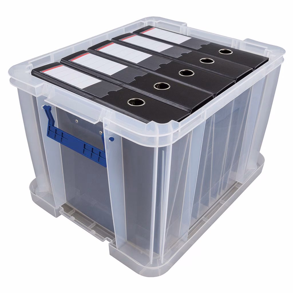 Robusta soluzione d'archivio in plastica per la casa ed il lavoro - maniglia di chiusura integrata nel lato della scatola.Lati ed angoli doppiamente rinforzati - base rinforzata - coperchio incassato per maggiore stabilità - contenuto protetto da umidità e polvere - in polipropilene privo di BPA - certificata idonea per contenere cibo - completamente riciclabile