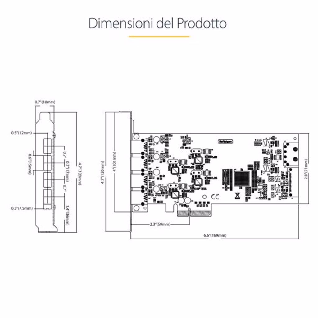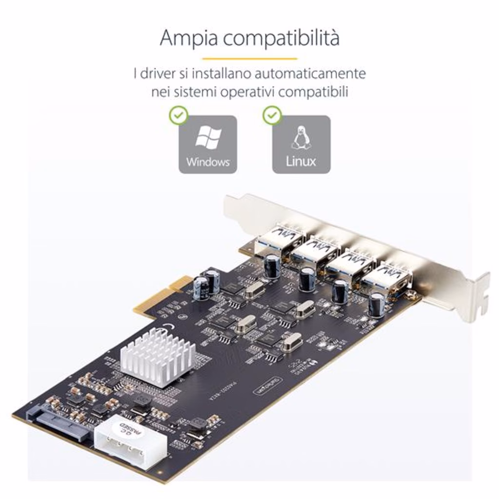 StarTech.com Scheda PCIe USB a 4 porte, USB 3.2 5Gbps, scheda di espansione PCI Express con 4 controller USB indipendenti, 4 porte USB-A, Windows/macOS/LinuxAggiungi quattro porte USB Type-A da 5Gbps tramite PCI Express Potenziate o espandete la connettività USB di un computer desktop o di un server aggiungendo quattro porte USB Type-A 5Gbps indipendenti su un singolo collegamento PCI Express 2.0 x4. USB 5Gbps Dedicato per Porta Quando sono collegati più dispositivi, le tradizionali schede USB 3.2 Gen 1 a bus singolo condividono la massima larghezza di banda su tutte le porte. Grazie all'impiego di quattro chipset di controller host, ogni porta opera sul proprio canale indipendente, fornendo fino a 5 Gbps a ciascuna porta USB, riducendo i colli di bottiglia delle prestazioni e quadruplicando di fatto la larghezza di banda totale disponibile fino a 20 Gbps. Ricarica dei Dispositivi USB Questa scheda di espansione USB PCIe può ricevere alimentazione supplementare attraverso i connettori SATA o LP4. Supporta la specifica di Ricarica della batteria 1.2 (5V 1.5A) e fornisce fino a 5V 2A (10W) sulle porte USB Tipo-A quando l'alimentazione del bus dalla scheda madre è insufficiente. Compatibilità I driver della scheda USB PCI Express si installano automaticamente nella maggior parte dei principali sistemi operativi, tra cui Windows 8 e successivi, macOS e Linux. La scheda di espansione supporta piattaforme hardware come Intel, AMD e Apple Silicon e si adatta agli slot PCI Express x4, x8 e x16. Le porte USB orizzontali migliorano la compatibilità con i diversi case dei computer, riducono il rischio di problemi di spazio tra le porte e consentono di utilizzare una gamma più ampia di dispositivi e cavi USB. The StarTech.com Advantage