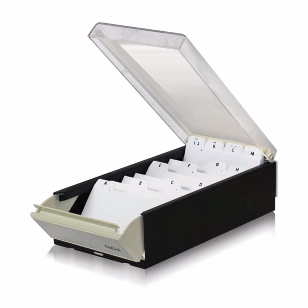 Contenitore in metallo per l'archiviazione di biglietti da visita, carte di credito e bancomat - coperchio in plastica antiurto trasparente - apertura frontale per un facile inserimento delle carte - completo di 20 divisori alfabetici scorrevoli in plastica rigida - può contenere fino a 600 biglietti del formato max cm 9,2x6