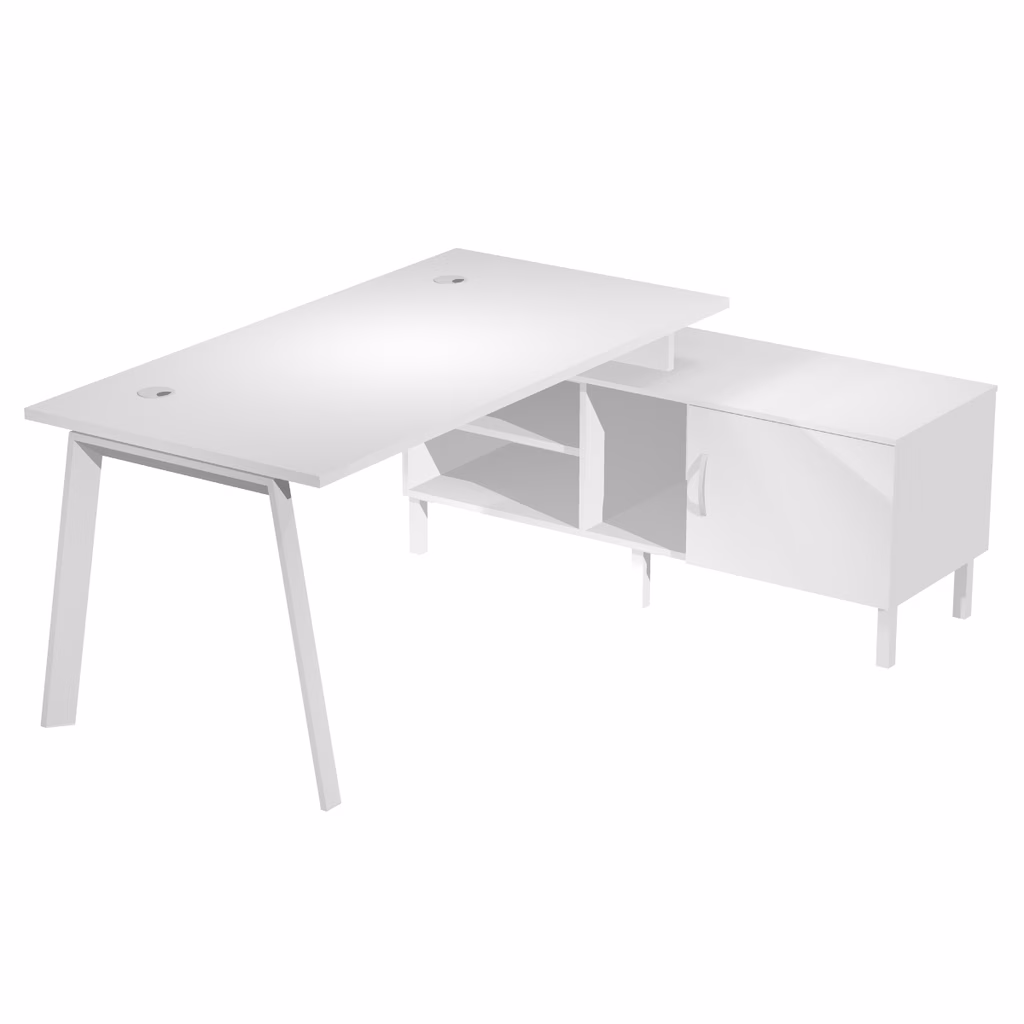 Scrivania dimensioni cm L185xP140xH73 su mobile di servizio colore bianco. Piano di lavoro in agglomerato ligneo nobilitato melaminico sp.25mm misura 160x80, bordato in abs sp.2 mm. Struttura in metallo, con solida gamba di sezione a cavalletto in metallo verniciato bianco. Piano di lavoro fornito di due passacavi diametro 80 mm per favorire canalizzazione. Finitura piano bianco