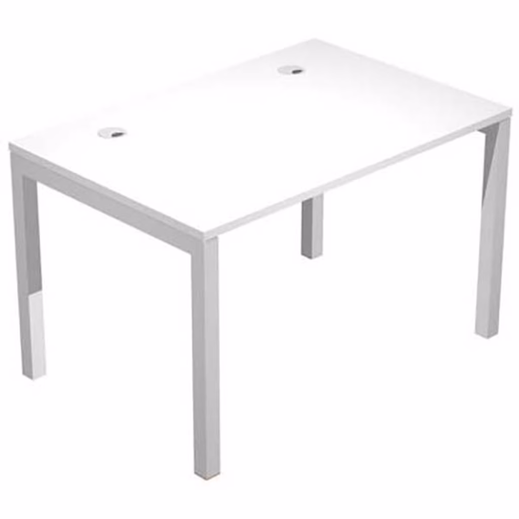 Scrivania dimensioni cm L120xP80xH73. Piano in agglomerato ligneo nobilitato melaminico sp.25mm, bordato in abs sp.2 mm. Struttura in metallo, con solida gamba di sezione 50x50 mm, finitura bianca. Piano di lavoro fornito di due passacavi diametro 80 mm per favorire canalizzazione. Finitura piano bianco