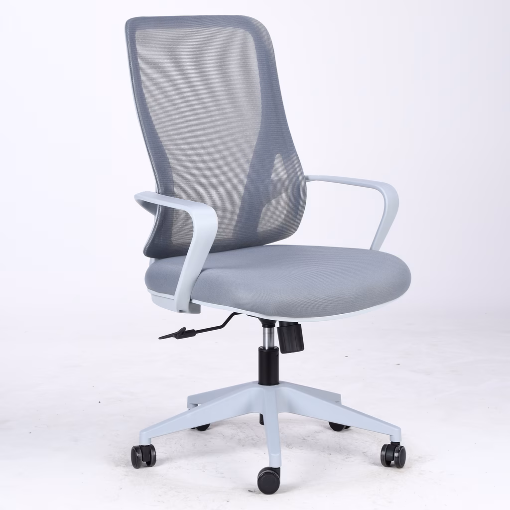 Schienale: medio ed ergonomico, struttura in nylon e rete portante ignifuga conforme a norma BS Sedile: in polipropilene ricoperto di resina poliuretanica densità 40kg/m3 e rivestito con tessuto Meccanismo: oscillante semplice 1 blocco Braccioli: fissi in nylon Elevazione seduta: gaslift Base: in nylon caricato diametro 700mm Ruote: libere in nylon diam.60mm Struttura e rete colore grigio