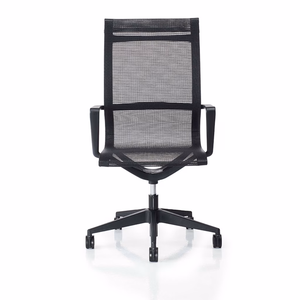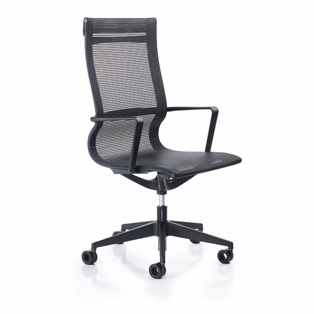 Design minimale caratterizzato dal massimo rigore estetico - Sedia direzionale caratterizzata da linee moderne e leggere, proposta nella versione alta - Struttura e braccioli fissi in polipropilene nero - Completamente rivestita in rete ergonomica e indeformabile disponibile nel colore nero - Elevazione a gas e meccanismo di oscillazione" balance" - Base a 5 razze di nylon nero con ruote gommate e auto-frenanti - Garanzia 3 anni
