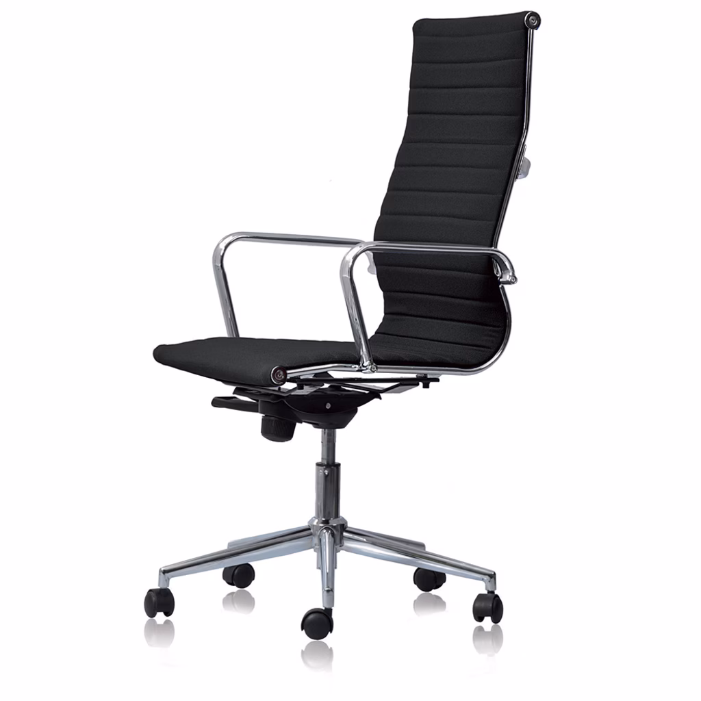 Sedia direzionale con struttura portante e braccioli in acciaio cromato - Imbottitura frontale rivestita in soffici doghe - Proposta con schienale alto e medio su base a 5 razze con ruote in acciaio cromato, oppure con schienale medio su base a 4 razze su piedini, girevole e regolabile in altezza - Versione su ruote con movimento regolato da meccanismo oscillante centrale dotato di manopola regola tensione - Proposta con rivestimento in pelle, in ecopelle ed in tessuto King (test usura: 100.000 cicli Martindale) - Garanzia 2 anni